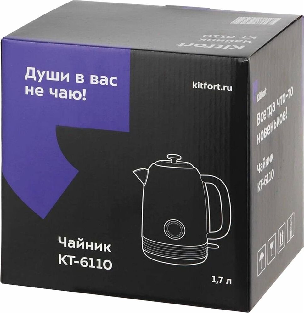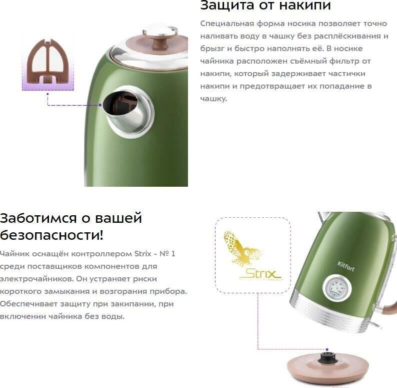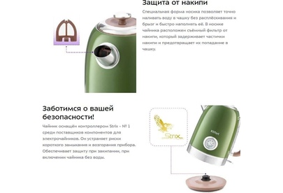 Режимы нагрева 100 °С. Ёмкость 1,7 л. Мощность 1850–2200 Вт. Длина шнура 0,75 м. Индикатор включения есть. Индикатор уровня воды есть. Фильтр от накипи есть. Автоматическое отключение есть. Подставка 360 градусов да. Защита от включения без воды есть.