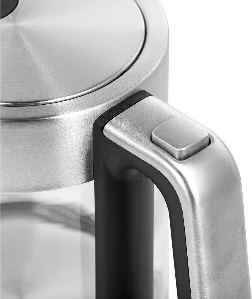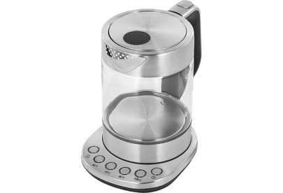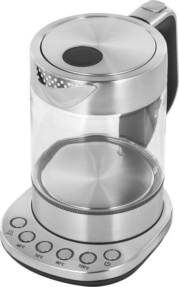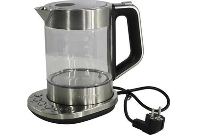Мощность 2200 Вт. Максимальный объем 1.5 л. Нагревательный элемент скрытый. Индикатор включения есть. Индикатор уровня воды есть. Автоматическое отключение есть. Регулировка температуры нагрева есть. Температурные режимы 4 шт. Звуковой сигнал при закипании есть. Материал корпуса нержавеющая сталь/стекло. Цвет серебристый.