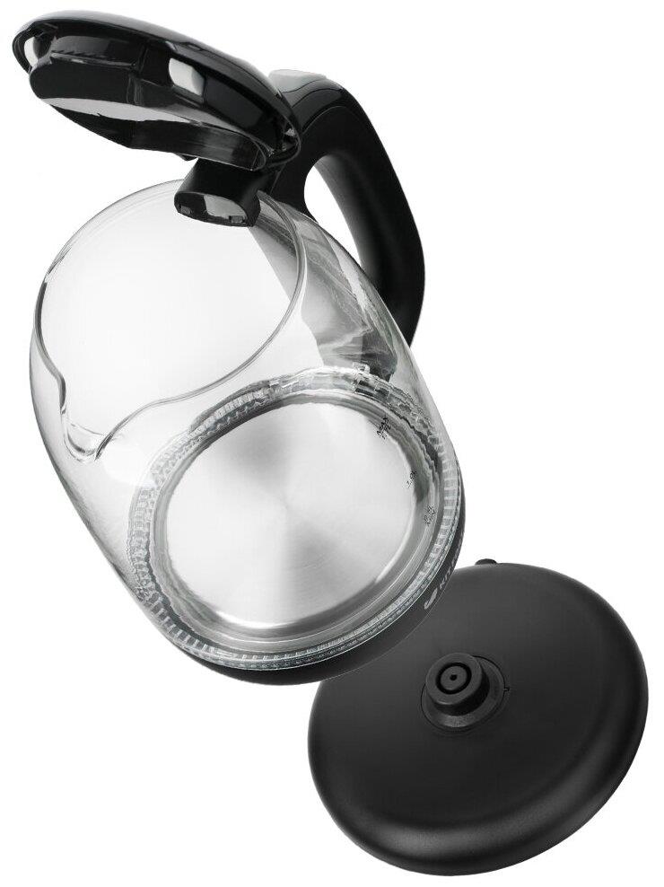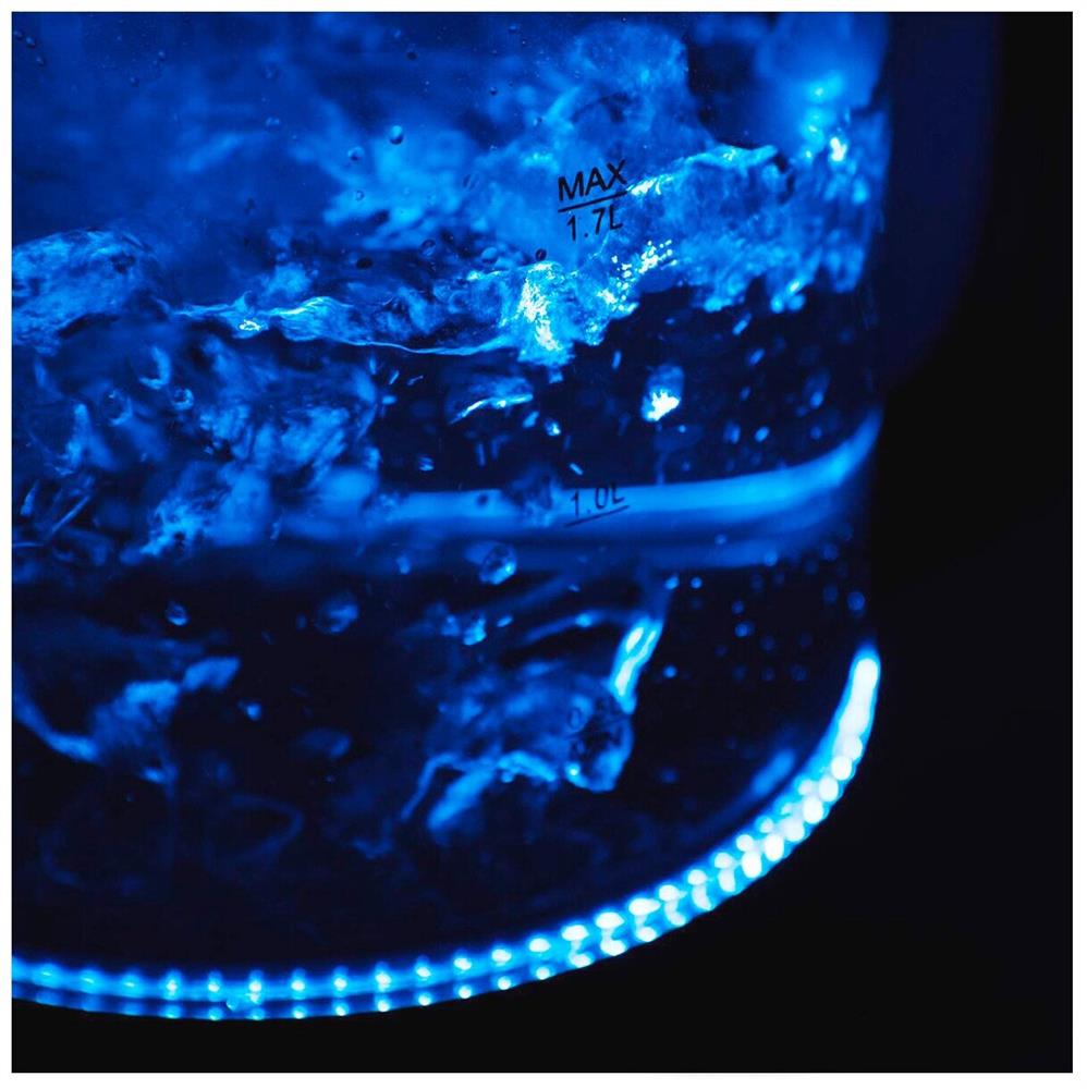 Мощность 2200 Вт. Максимальный объем 1.7 л. Нагревательный элемент скрытый. Индикатор уровня воды есть. Автоматическое отключение есть. Кнопка открытия крышки есть. Подставка 360 градусов да. Подсветка воды есть. Материал корпуса стекло и пластик.
