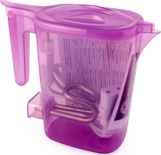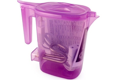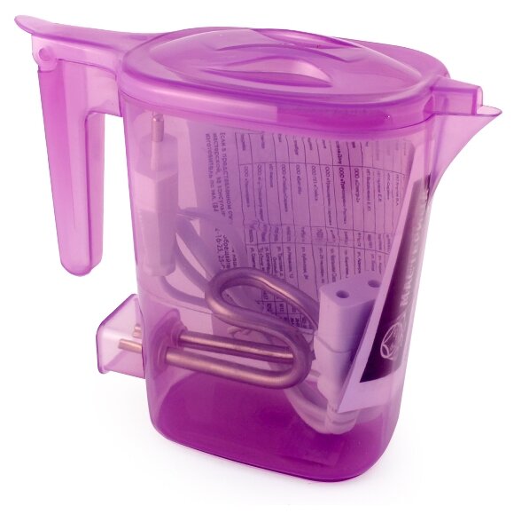 Мощность 500Вт. Объем 0,5л. Корпус пластик. Шкала уровня воды, нагревательный элемент - ТЭН спираль из нержавеющей стали, съемный шнур. Время закипания 3 мин. Цвет сиреневый прозрачный.