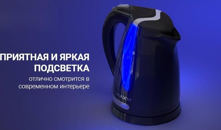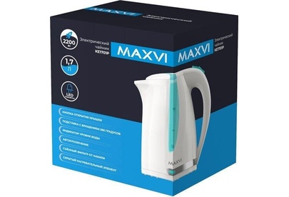 Мощность 2200 Вт, 1.7 литра, пластиковый корпус, LED-подсветка, кнопка открытия крышки, подставка с вращением 360 градусов, шкала уровня воды, автоотключение, съёмный фильтр от накипи, скрытый нагревательный элемент.
