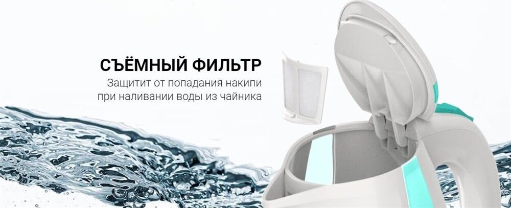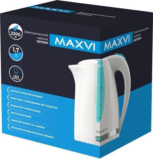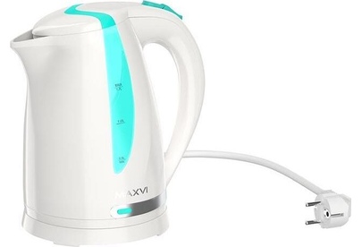 Мощность 2200 Вт, 1.7 литра, пластиковый корпус, LED-подсветка, кнопка открытия крышки, подставка с вращением 360 градусов, шкала уровня воды, автоотключение, съёмный фильтр от накипи, скрытый нагревательный элемент.