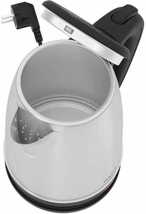 Мощность 1800 Вт, 1.8 литра, стальной корпус, подставка с вращением 360 градусов, световая индикация, автоотключение, скрытый нагревательный элемент.