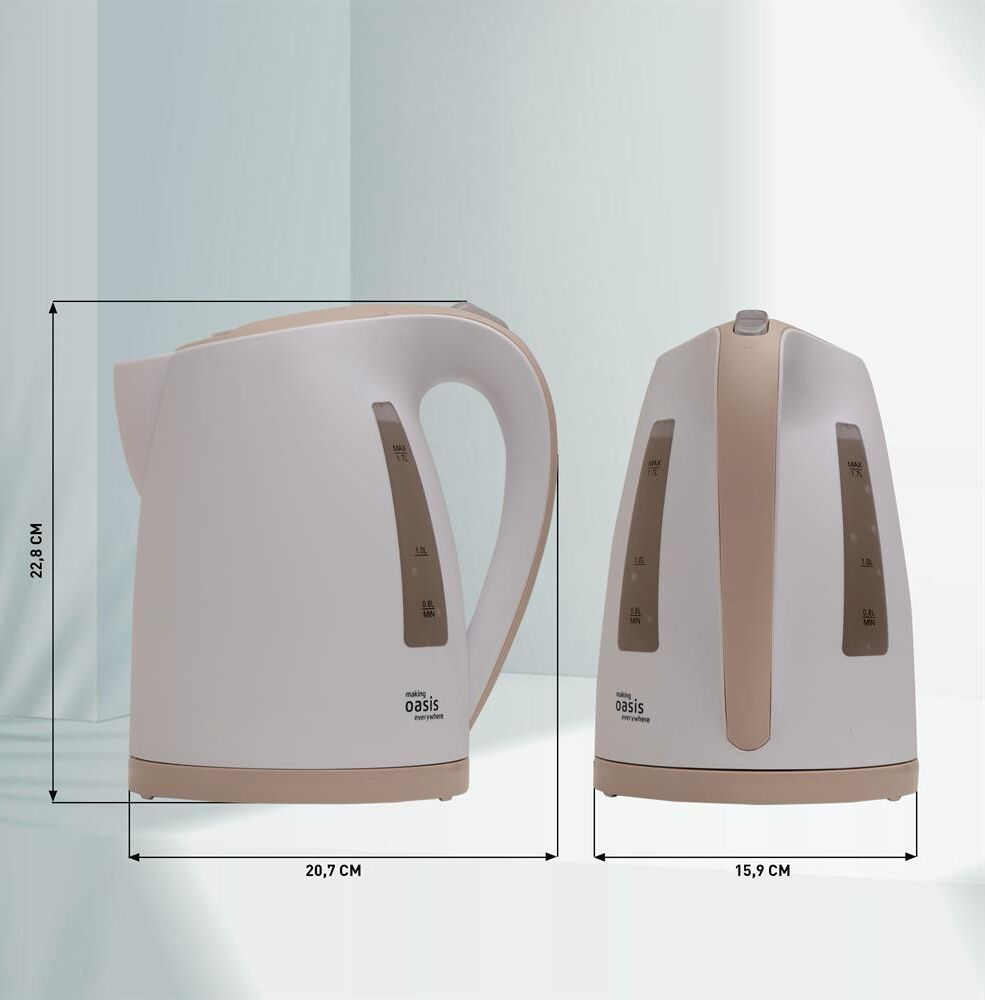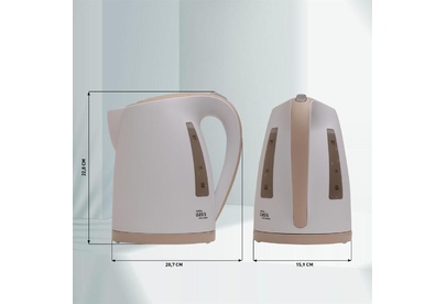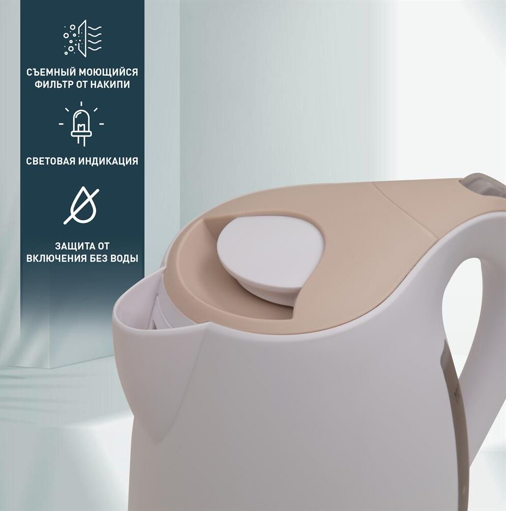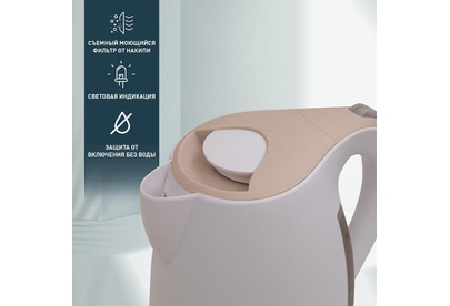 Объем 1,7 л Мощность 2200 Вт Автоотключение Защита от включения без воды 360° поворот корпуса Световая индикация Съемный и моющийся фильтр Цвет Белый+бежевый Материал полости Пищевой пластик Мощность, Вт 2200 Параметры электросети, В/Гц 220-240/50-60 Объем, л 1,7