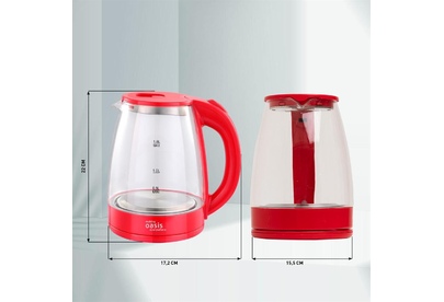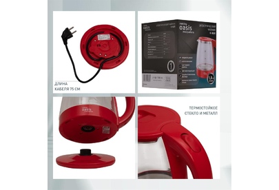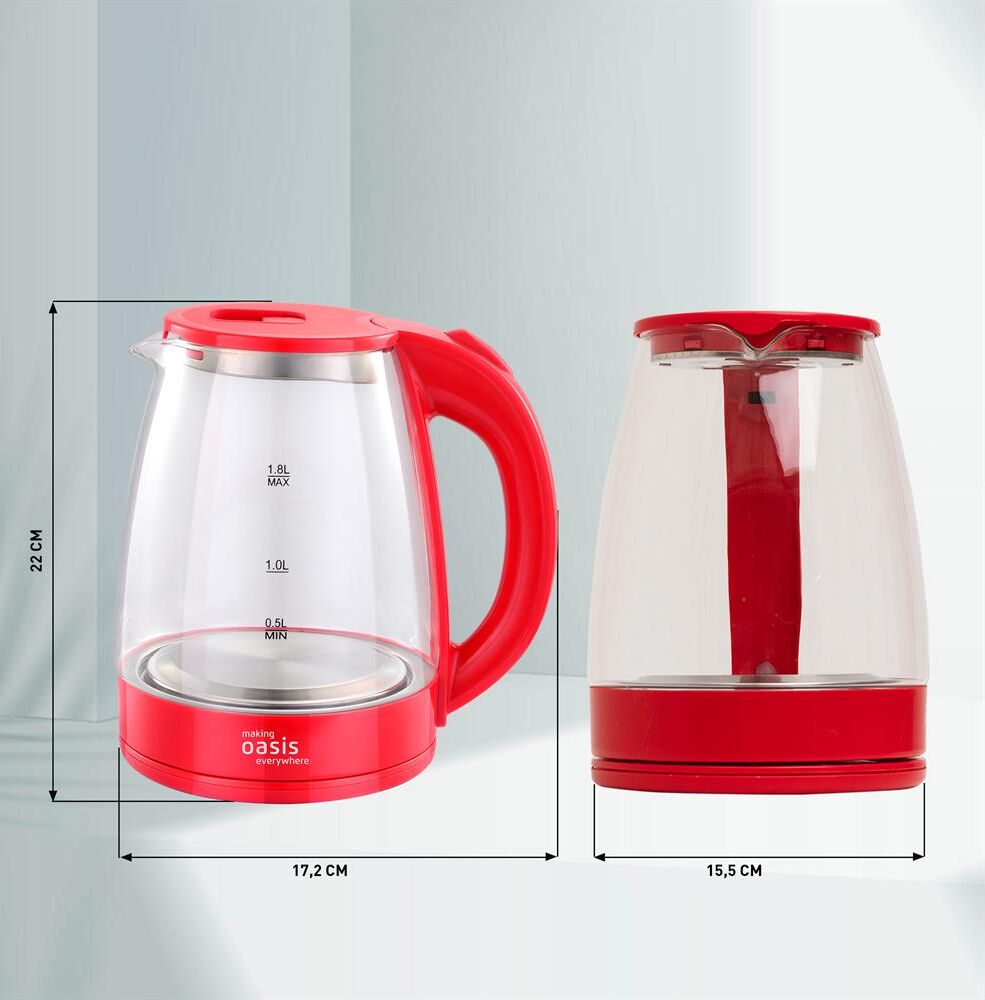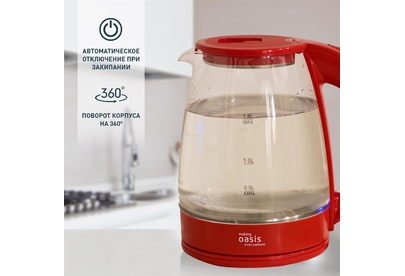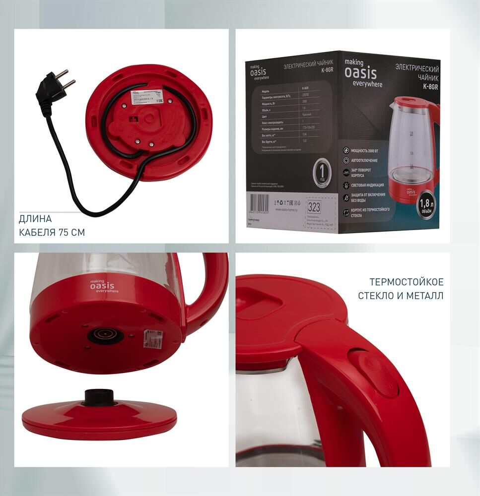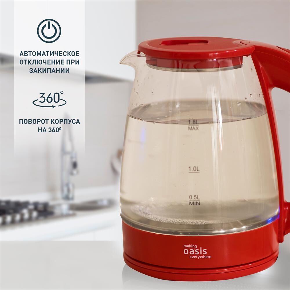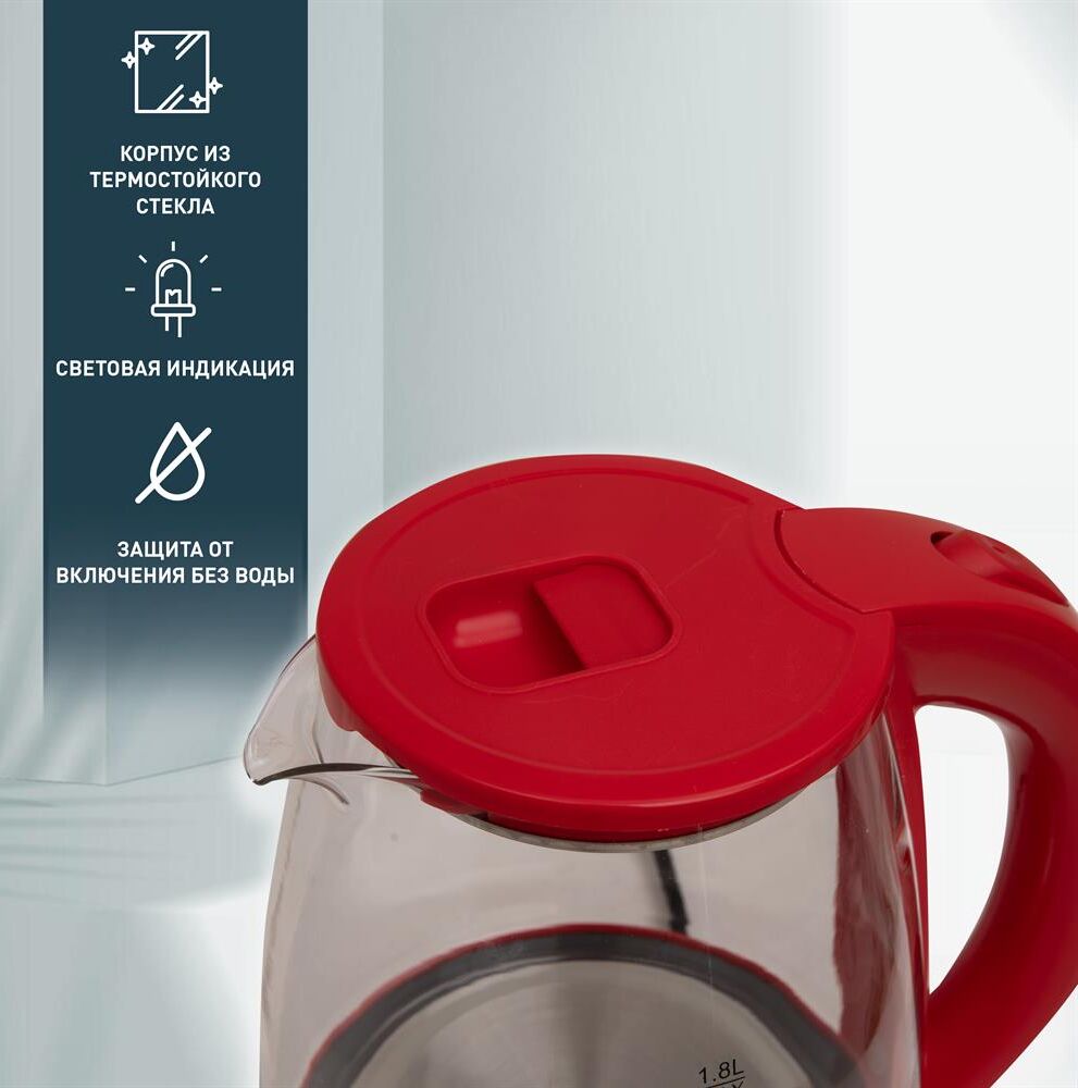 Объем 1,8 литра Корпус из термостойкого стекла Мощность 2000 Вт Автоотключение Защита от включения без воды 360° поворот корпуса Световая индикация Цвет Красный Материал полости Термостойкое стекло Параметры электросети, В/Гц 220/50 Мощность, Вт 2000 Объем, л 1,8