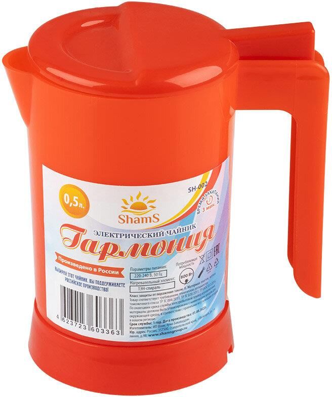 объем 0.5 л, мощность 800 Вт, нагревательный элемент – открытая спираль, длинна шнура - 0,7м материал корпуса: пластик Производство - Россия красный