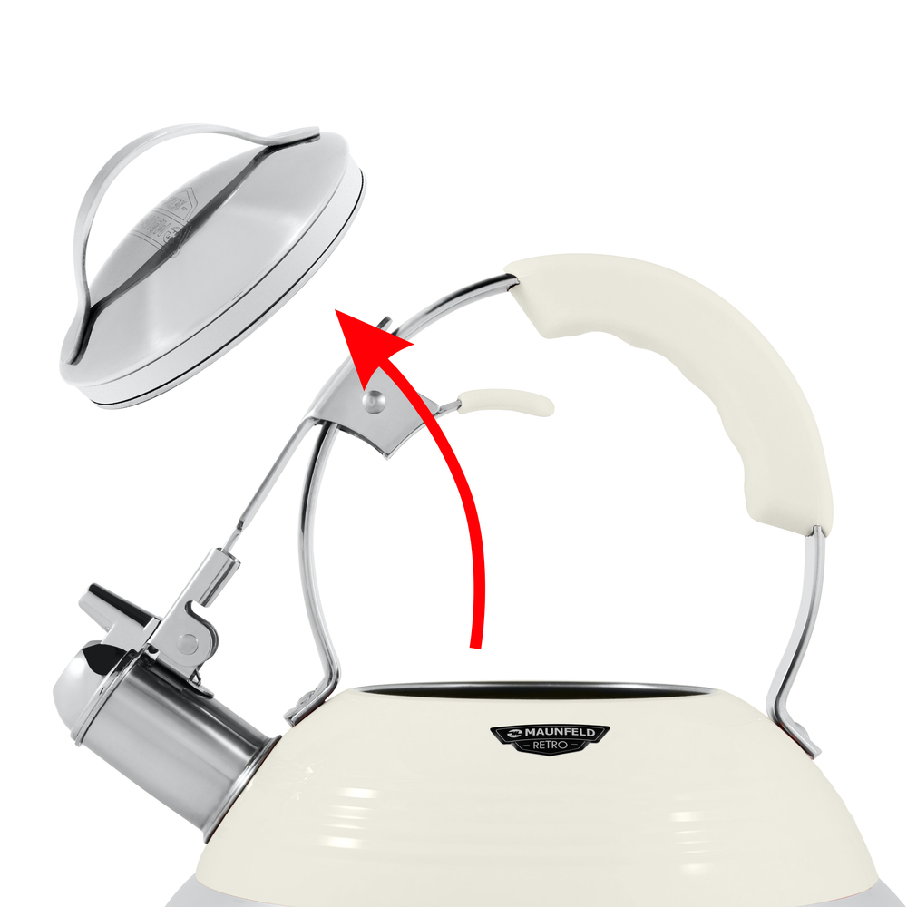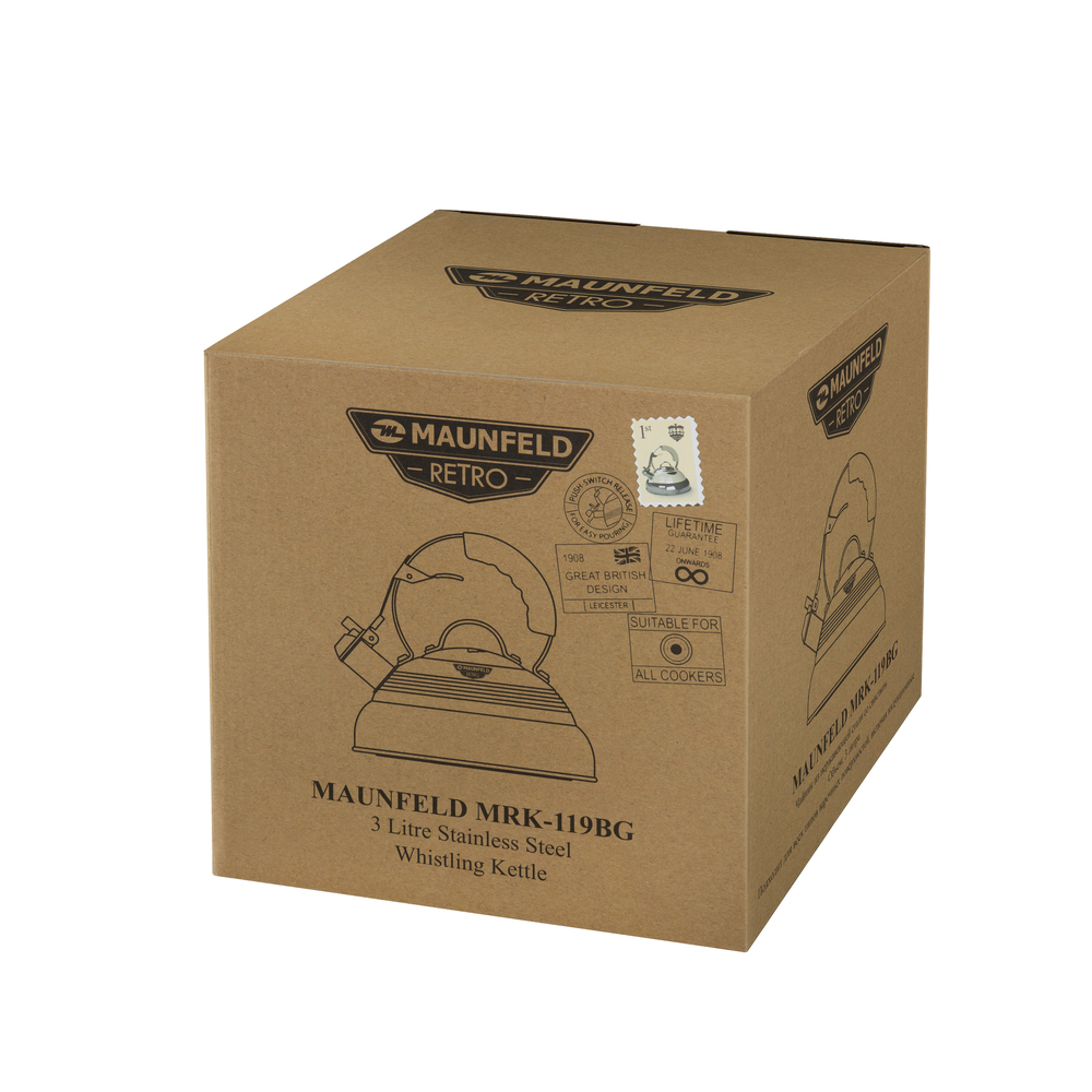 Maunfeld MRK-119BG — это чайник со свистком, пригодный для нагрева на всех типах варочных поверхностей. Корпус выполнен из металла (нержавеющей стали и алюминия), свисток — из сплава цинка. Ручка также металлическая, с накладкой из термостойкого пластика. Модель относится к коллекции «Retro». Ключевые преимущества: Ретро-дизайн Совместим с любыми типами варочных поверхностей Объём 3 литра