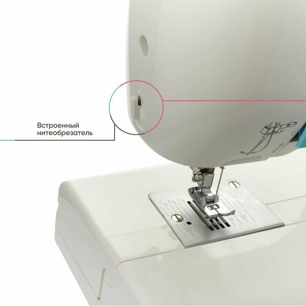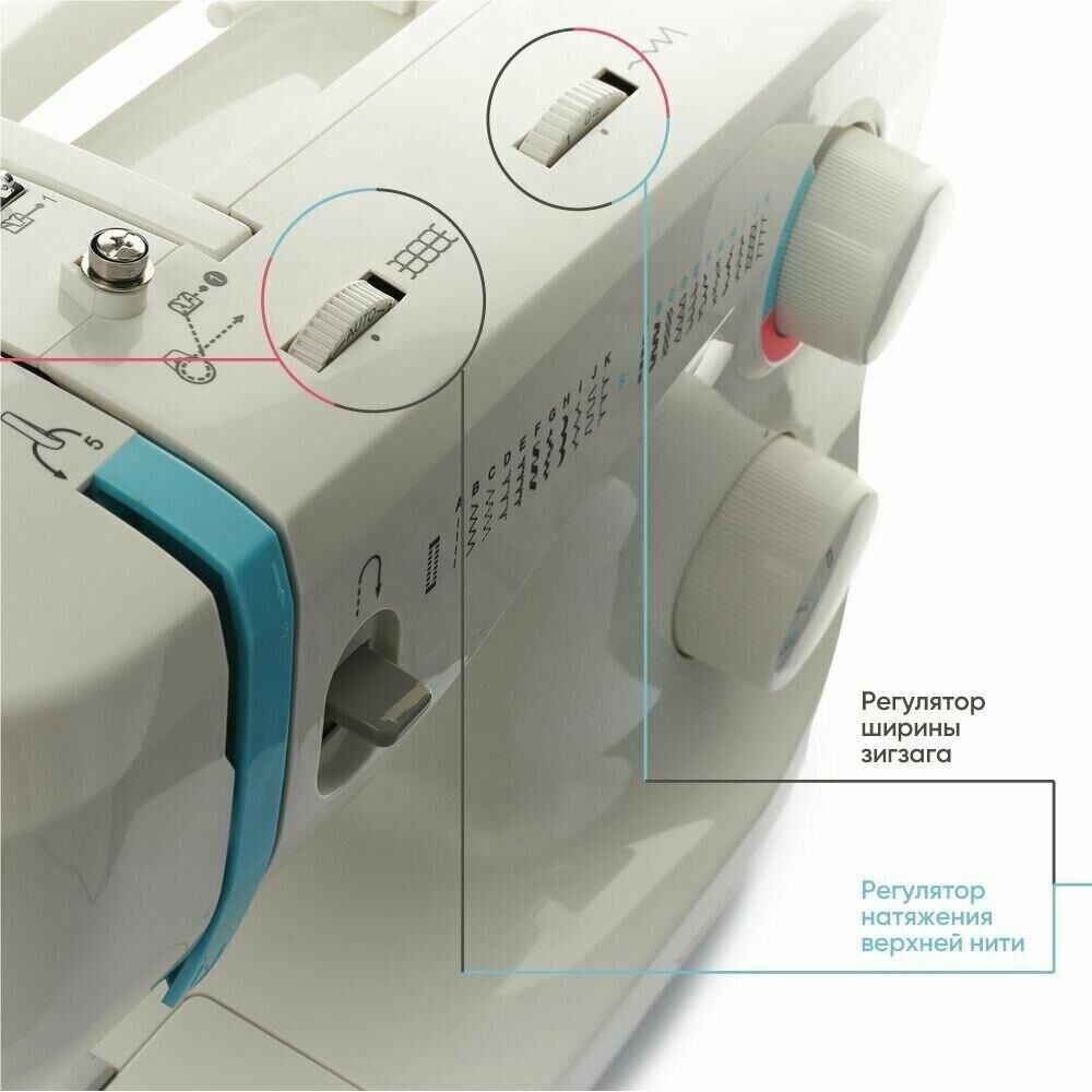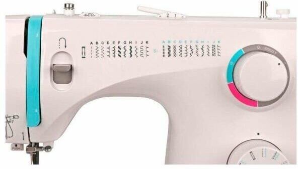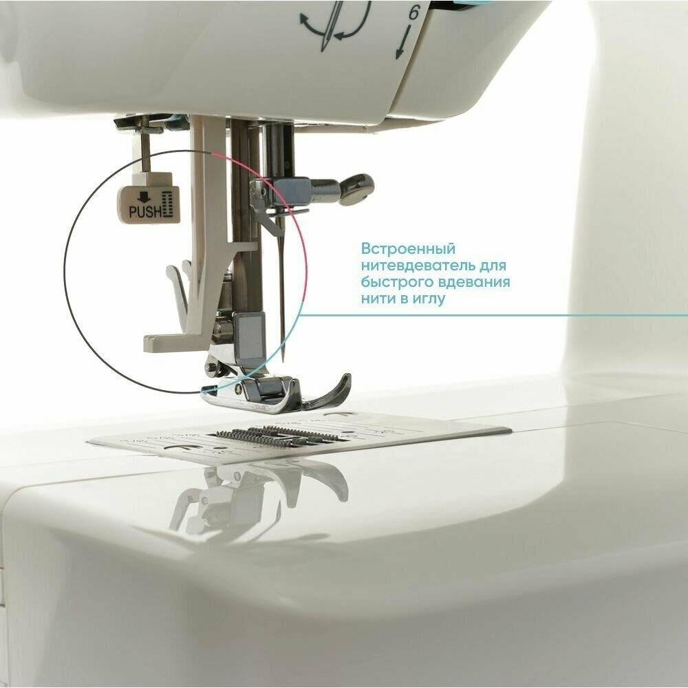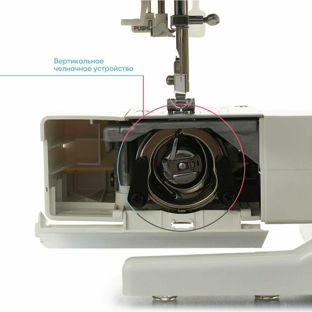 23 операции: прямая строчка, зигзаг, потайные строчки, декоративные строчки, трикотажные строчки, оверлочные строчки, строчки для квилтинга, петля-авт.; вертик. челнок; съёмная рукавная панель; нитевдеватель; регулятор ширины зигзага; мягкий чехол