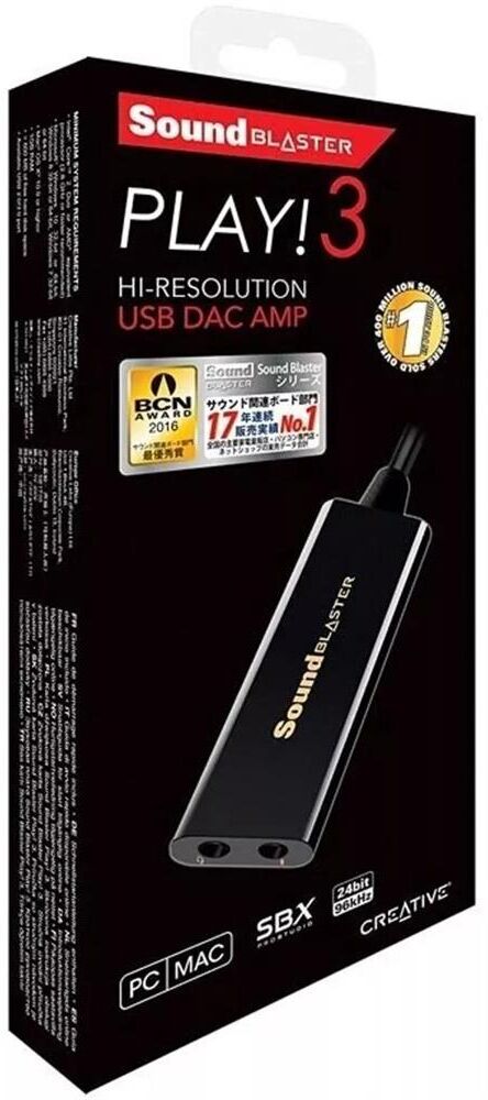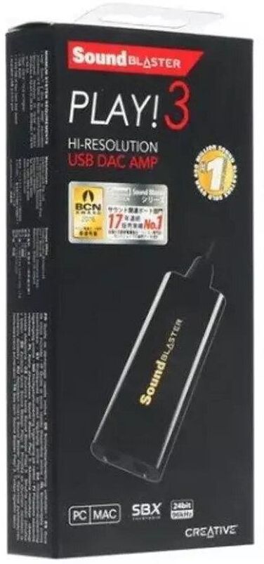 Интерфейс: USB. Звуковая схема: 2.0. Количество микрофонных входов: 1. Количество независимых выходов на наушники: 1. Тип поставки: retail. Особенности: Sound Blaster PLAY! 3 Control Panel предлагает потрясающий аудиореализм и захватывающие звуковые эффекты, а также оптимизированные профили для избранных моделей наушников. Технология SBX Pro Studio усиливает эффект объемного звучания, позволяя вам наслаждаться кинотеатральным качеством звука.. Габариты упаковки (ед) ДхШхВ: 0.157x0.076x0.026. Вес упаковки (ед): 0.07. Гарантия: 12 мес.. Тип поставки: retail. Интерфейс: USB. Звуковая схема: 2.0. Разъемы: микрофонные входы х 1, выходов на наушники х 1