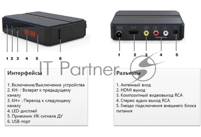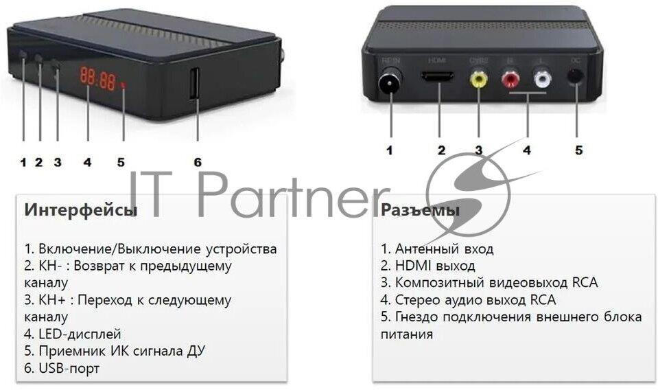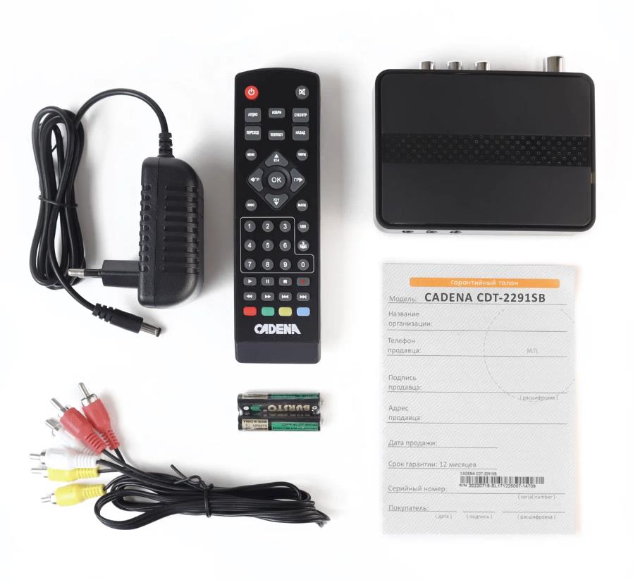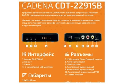 Приставка для цифрового ТВ CADENA CDT-2291SB предназначена для просмотра бесплатного цифрового эфирного телевидения высокого качества. Поддерживаемый стандарт DVB-T/T2. Высокочувствительный тюнер обеспечивает стабильное качество принимаемого сигнала. При подключении внешнего USB устройства можно записывать транслируемые телевизионные каналы, а так же воспроизводить мультимедийные файлы и изображения на телевизор. Приставка имеет поддержку функции родительского контроля. Меню, Пульт ДУ и руководство пользователя полностью на русском языке. На лицевой панели расположены дисплей и кнопки. На задней панели расположены антенный ВЧ вход; разъемы HDMI и RCA; гнездо подключения внешнего блока питания. На боковой панели расположен порт USB 2.0. В комплектацию устройства включены кабель 3RCA – 3RCA, адаптер питания, пульт ДУ, батарейки, руководство пользователя и гарантийный талон. Подарок от Триколор: ПРОМОКОД на 45 дней просмотра онлайн-кинотеатра «Триколор Кино и ТВ». Предоставляется доступ к услуге «Смотри Кино и Т