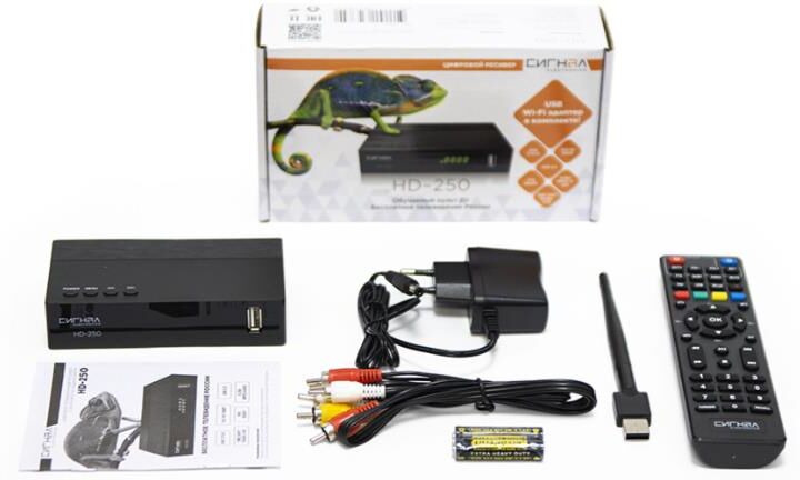 Обратите внимание на новую модель в линейке ресиверов СИГНАЛ - HD-250. Это высококачественный ТВ ресивер с обучаемым пультом управления в комплекте (можно с одного пульта управлять и ресивером, и телевизором). HD-250 подходит для приема ЭФИРного цифрового телевидения в формате DVB-T/T2/C. Его яркая упаковка не останется незамеченной на полке магазина. Сам ресивер выполнен из пластика и в лаконичном дизайне. Особенность этого ресивера в его комплектации. Вместе с устройством вы получаете USB Wi-Fi адаптер 7601. Это позволяет телевизору с помощью ресивера подключаться к беспроводной сети. Так с TV устройства можно выходить в интернет. На ресивере расположены следующие разъемы: антенный вход, 2 USB-разъема, HD OUT, композитный аудио-видео выход, разъем для подключения внешнего блока питания. HD-250 оснащен чипсетом GX6701. Поддерживает диапазон частот 174-862МГц. Ресивер имеет размер 120х64х28мм. Рабочая мощность составляет 6Вт. Входное напряжение 220В 50ГЦ, БП 5В 2А. Наш ресивер - идеальный выбор для вас! Товар