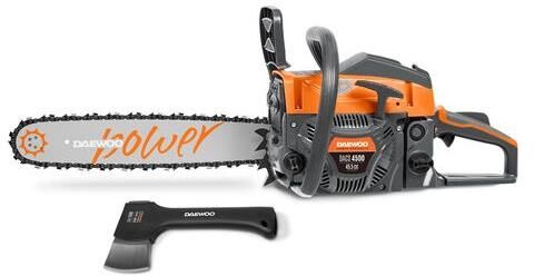 Тип: Бензопила. Длина пильной шины: 16" (40 см). Электропитание: 0. Тип аккумулятора: 0. Натяжение цепи: с использованием инструментов. Вес товара: 6.6. Топливный бак, объем: 0.55. Бак смазки цепи, объем: 0.31. Электронное зажигание: есть. Рабочий объем двигателя: 45.5. Мощность двигателя, л.с.: 3.2. Тип двигателя: бензиновый. Особенности: Электронное зажигание C.D.I.; Антивибрационная система DAEWOO; Корпус двигателя из металла; Поршневая группа с никасиловым покрытием; Моментальная остановка цепи; Эргономичная рукоятка включения; Металлический зубчатый упор. Тип бензинового двигателя: 2-х тактный. Шаг цепи: 0.325. Количество звеньев цепи: 66. Ширина паза цепи: 1.5 мм. Комплектация: Бензопила, топор. Максимальная частота вращения: 10800. Тип топлива: АИ-92. Габариты упаковки (ед) ДхШхВ: 0.45x0.261x0.3. Вес упаковки (ед): 8.2. Гарантия: 12 мес.. Длина шины: 16" (40 см). Объем двигателя: 45.5 см3. Вес: 6.6 кг. Двигатель: бензиновый, 2-х тактный, макс. 10800 об/мин, 3.2 л.с. Аккумулятор: 0. Цепь: шаг 0.325, шир