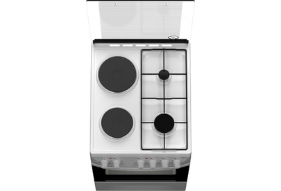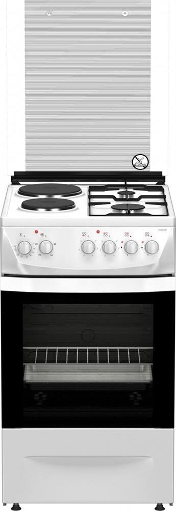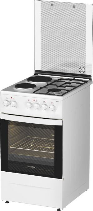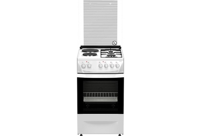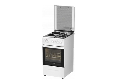 (ШхГхВ)50х60х85см. Цвет белый.Объем духовки, л.50.Количество конфорок 4. Газовые горелки стола 2.Электроконфорки (1кВт) 2.Электрическая духовка. Количество режимов духовки 4.Интегрированный электрический розжиг горелок стола.Терморегулятор.Подсветка.Выдвижной ящик.Регулируемые опоры. Крышка стеклянная.
