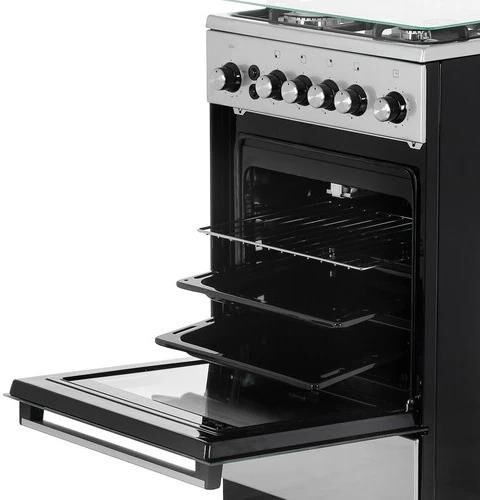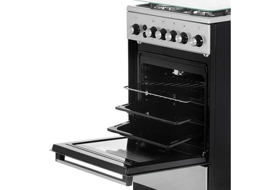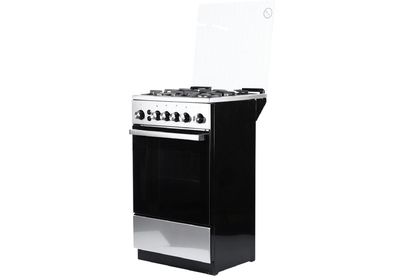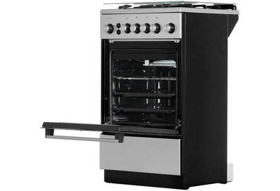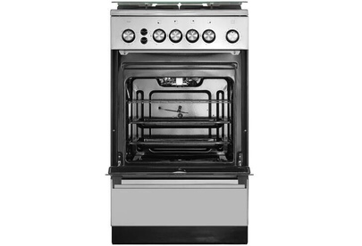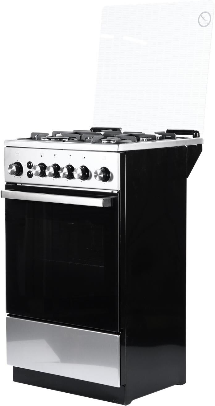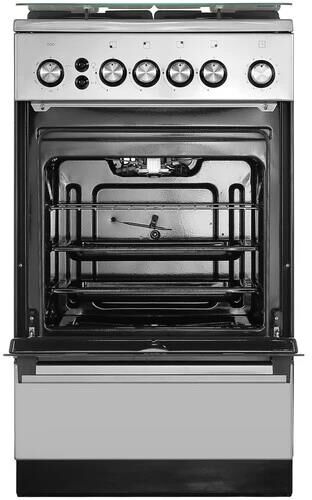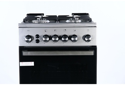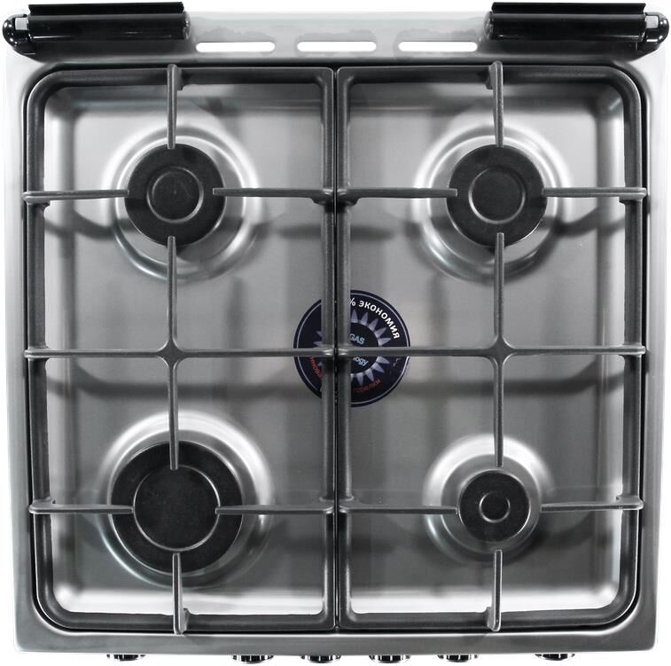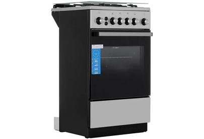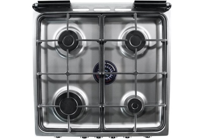 Габариты: 85х50х50 см. Рабочий стол: нержавеющая сталь. Количество конфорок: 4 газовые. Мощность конфорок: 1,0/1,75/1,75/3,0 кВт. Чугунная решётка. Газ-контроль полный. Интегрированный электрический розжиг горелок стола. Духовка: газовая. Объем: 46 л. Терморегулятор. Освещение. Гриль с вертелом.