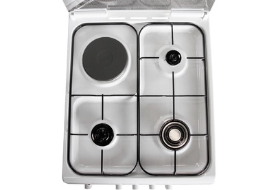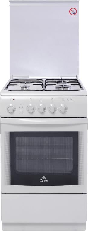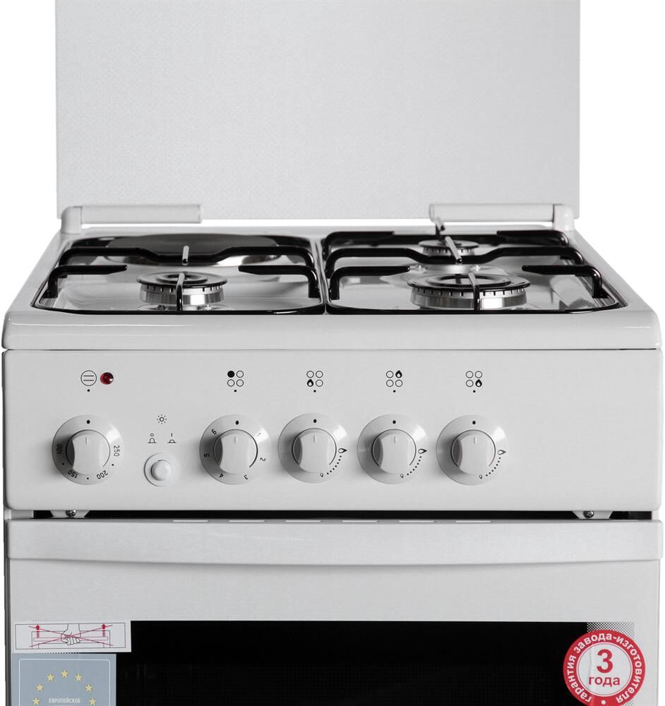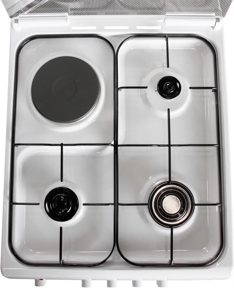 Габариты 850*500*600 Вес, кг - 38 Объём духовки 54 л. Основные характеристики варочной поверхности: 3 газовые конфорки 1,0/1,7/3,0 кВт 1 электрическая конфорка 1,5 кВт Основные характеристики духового шкафа: Электрическая духовка Нижний ТЭН - 1,2 кВт Верхний ТЭН - 0,8 кВт Терморегулятор Освещение Комплектация: Большой противень Малый противень Решётка для жарки Эмалированная решётка Стеклянная крышка рабочего стола Хозяйственный отсек Техническое описание: Цвет - белый