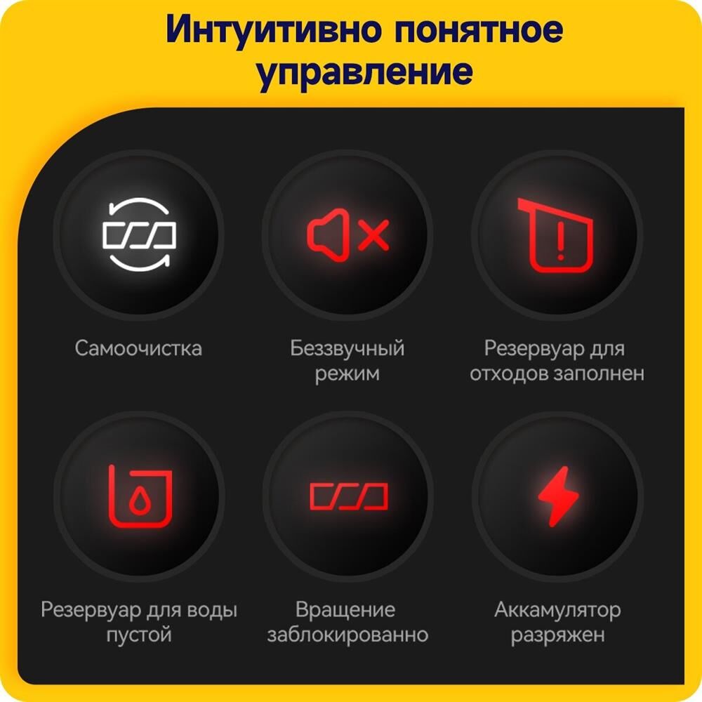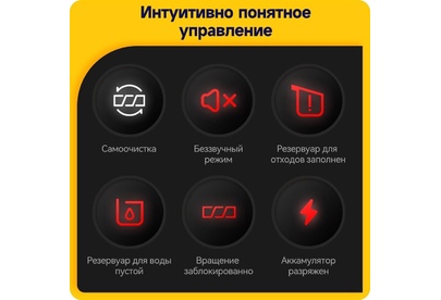 включения, заполнения пылесборника, режима работы, степени зарядки