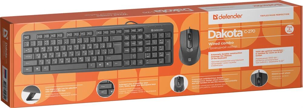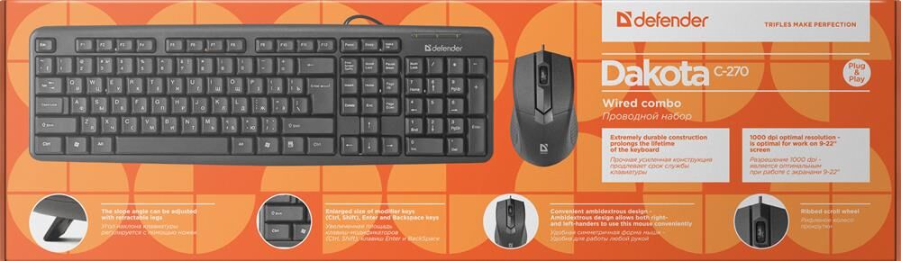 Проводной мультимедийный набор (клавиатура + мышь), клавиатура: количество клавиш - 104+3, интерфейс подключения - USB, усиленная конструкция, классическая раскладка, ; мышь - количество кнопок - 2+колесо прокрутки, разрешение - 1000 dpi, длина кабеля - 1,5 м