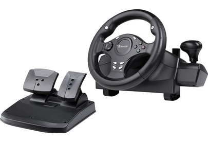 Проводной игровой руль с эффектом вибрации, удобными педалями и рычагом переключения передач. Поддерживаемые платформы: PlayStation® 3, PlayStation® 4, Android 5.0 и выше, Android TV box, XBOX 360, Nintendo Switch, XBOX One, Xbox Series X/S , ПК (Dinput и Xinput). Руль надежно крепится к столешнице при помощи струбцин.