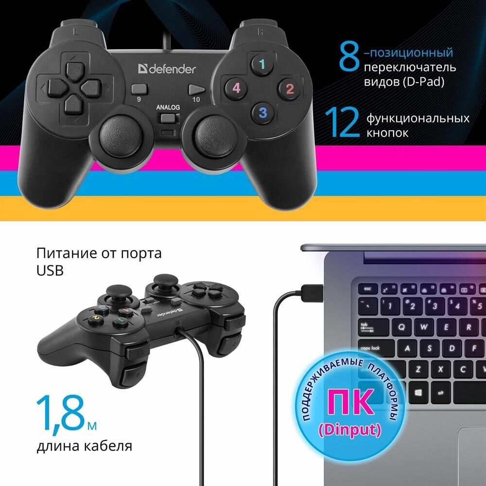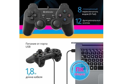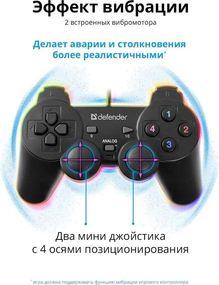 Проводной геймпад, 12 функциональных кнопок, 2 аналоговых джойстика, 2 мини джойстика позволяют играть в дополнительные игры, например, в футбольные симуляторы, 8-позиционный переключатель видов, эффект вибрации - делает аварии и столкновения более реали