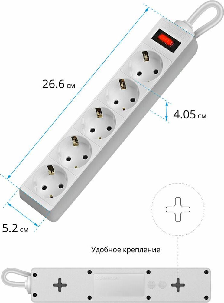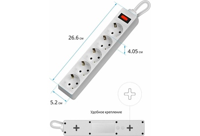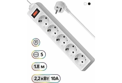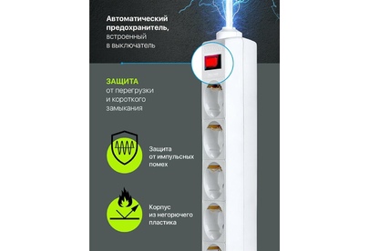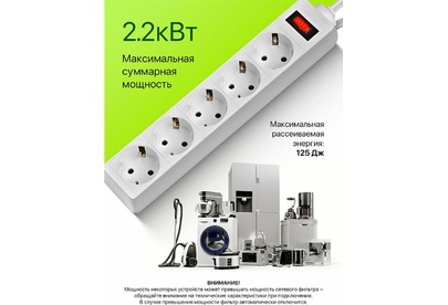 5 розеток с заземлением, 220 В/ 50 Гц, 10 A. Максимальная рассеиваемая энергия: 90 Дж. Суммарная мощность нагрузки: 2200 Вт. Длина шнура: 1.8 м