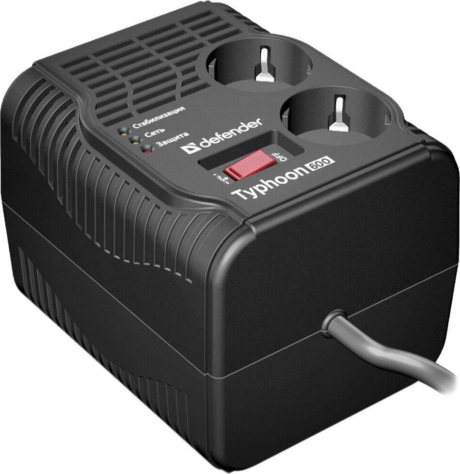Стабилизатор, максимальная мощность 200 Вт, диапазон входного напряжения 175–285 В, диапазон выходного напряжения 198–242 В, максимальная рассеиваемая энергия 180 Дж, количество розеток с заземлением 2 шт., регулятор напряжения со встроенным сетевым фильтром, защита от перегрузки и перегрева, длина кабеля - 0,6 м.