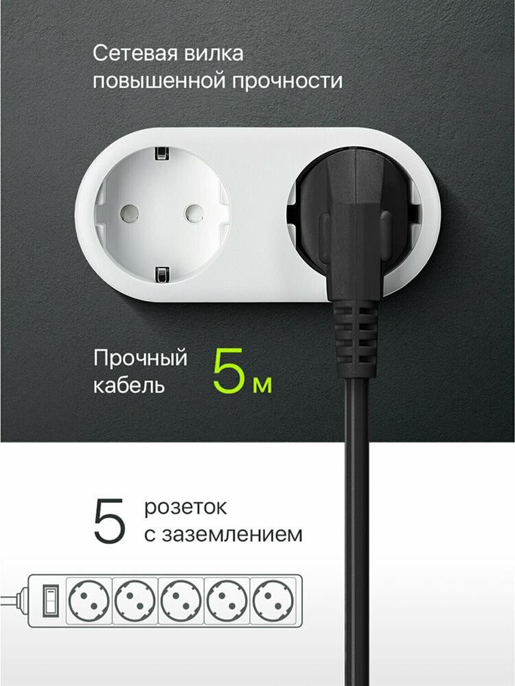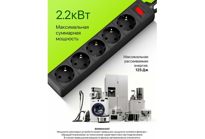 Номинальное напряжение: 220 В/ 50 Гц. Максимальный ток нагрузки: 10 A. Максимальная рассеиваемая энергия: 90 Дж. Суммарная мощность нагрузки: 2200 Вт. Количество розеток: 5 розеток с заземлением