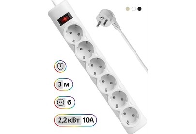 Сетевой фильтр, номинальное напряжение: 220 В/ 50-60 Гц, мощность нагрузки 2200 Вт, максимальный ток нагрузки 10А, защита от перегрузок и короткого замыкания, на «борту» имеет 6 розеток евростандарт, длина шнура 3 м