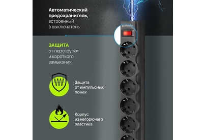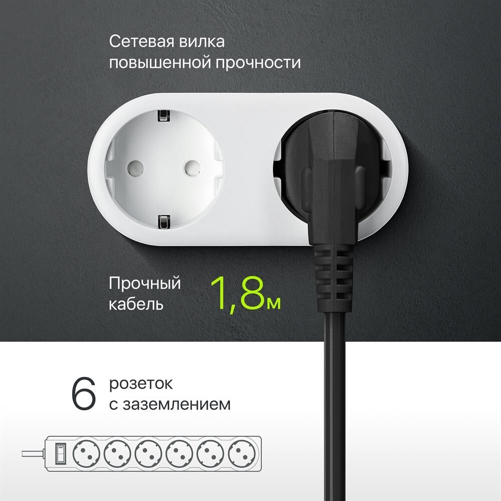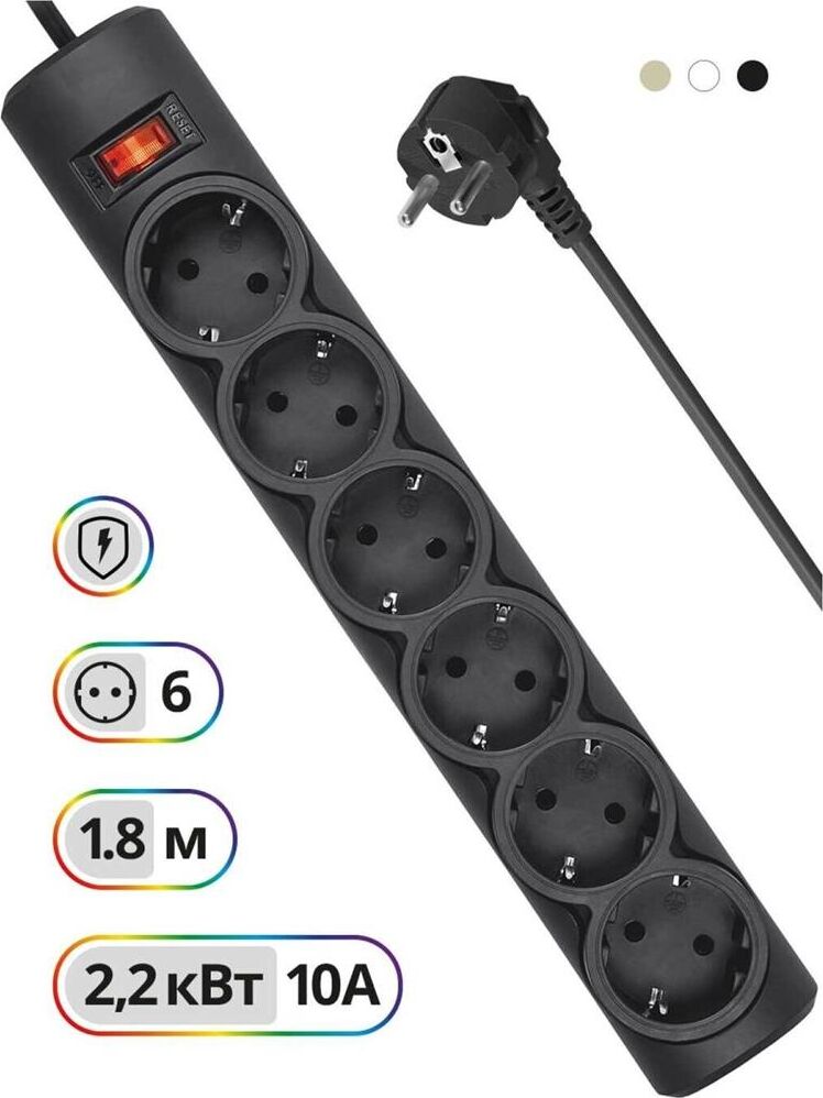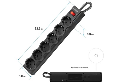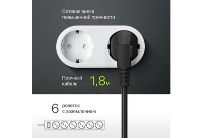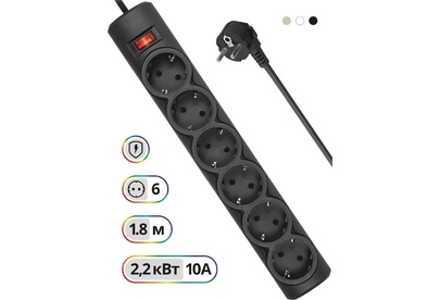 Сетевой фильтр, номинальное напряжение: 220 В/ 50-60 Гц, мощность нагрузки 2200 Вт, максимальный ток нагрузки 10А, защита от перегрузок и короткого замыкания, на «борту» имеет 6 розеток евростандарт, длина шнура 1,8 м.