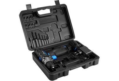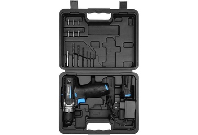 Напряжение АКБ: 12 В Макс. диаметр сверления (дерево/металл): 25/10 мм Размер зажимаемой оснастки: 0,8-10 мм Обороты 1-я/2-я скорости: 0-400/0-1500 об/мин Комплектация: 1 шт аккумуляторная дрель-шуруповерт 2 шт АКБ 1 шт зарядное устройство 6 шт биты 6 шт сверла 1 шт удлинитель для бит 1 шт руководство по эксплуатации 1 шт кейс