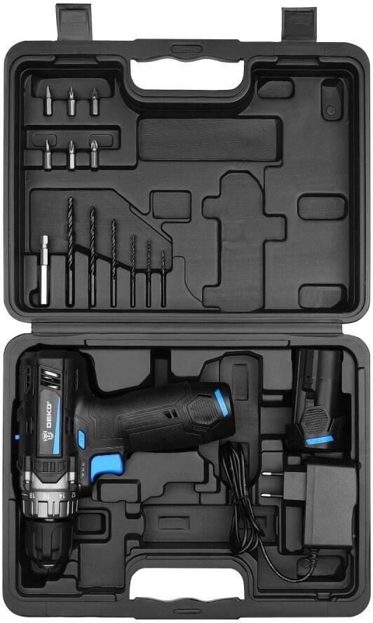 DEKO DKCD12V PRO в кейсе + оснастка 13 шт, 12В, 2х2.0Ач 083-1007