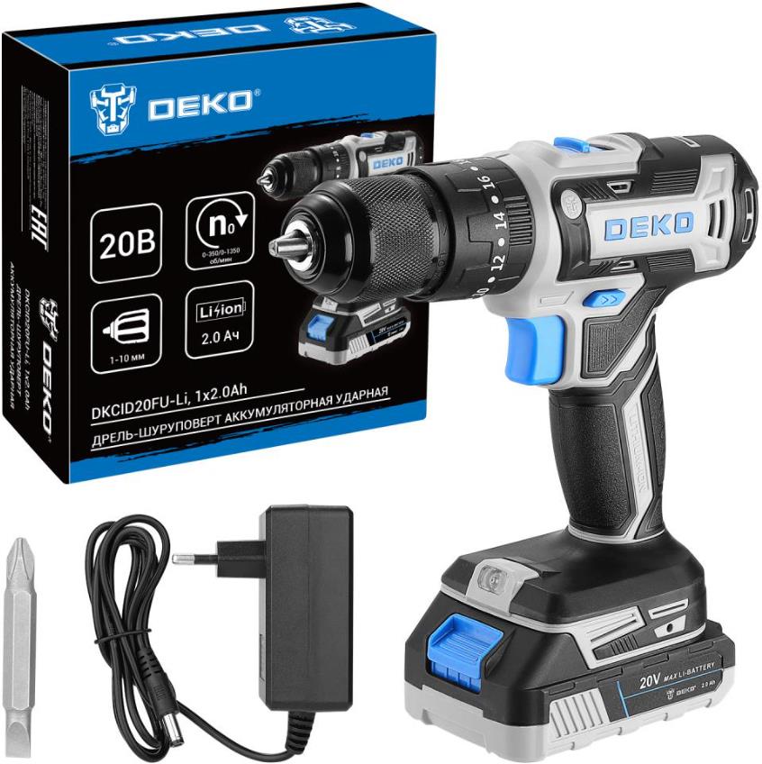 Дрель-шуруповерт аккумуляторная ударная DEKO ;DKCID20FU-Li, 1х2.0Ah ; ;предназначена для строительных, слесарно-монтажных работ. Инструмент помогает быстро высверливать отверстия нужного диаметра как на деревянной, так и металлической поверхности, быстро вкручивать или извлекать крепеж. ;Технические характеристики:Напряжение АКБ: 20 ВЕмкость АКБ: 2000 мАчЧисло оборотов: 0-350/0-1350 об/минЧастота ударов: 20500 уд/минМакс. крутящий момент: 40 НмРазмер зажимаемой оснастки: 1-10 ммЧисло ступеней крутящего момента: 18+3Комплектация:1 шт дрель аккумуляторная1 шт аккумулятор1 шт зарядное устройство1 шт бита1 шт руководство по эксплуатации