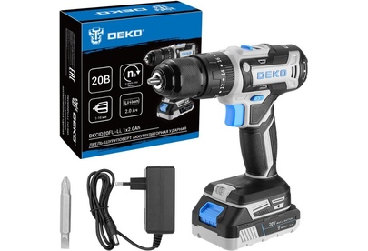 Дрель-шуруповерт аккумуляторная ударная DEKO ;DKCID20FU-Li, 1х2.0Ah ; ;предназначена для строительных, слесарно-монтажных работ. Инструмент помогает быстро высверливать отверстия нужного диаметра как на деревянной, так и металлической поверхности, быстро вкручивать или извлекать крепеж. ;Технические характеристики:Напряжение АКБ: 20 ВЕмкость АКБ: 2000 мАчЧисло оборотов: 0-350/0-1350 об/минЧастота ударов: 20500 уд/минМакс. крутящий момент: 40 НмРазмер зажимаемой оснастки: 1-10 ммЧисло ступеней крутящего момента: 18+3Комплектация:1 шт дрель аккумуляторная1 шт аккумулятор1 шт зарядное устройство1 шт бита1 шт руководство по эксплуатации