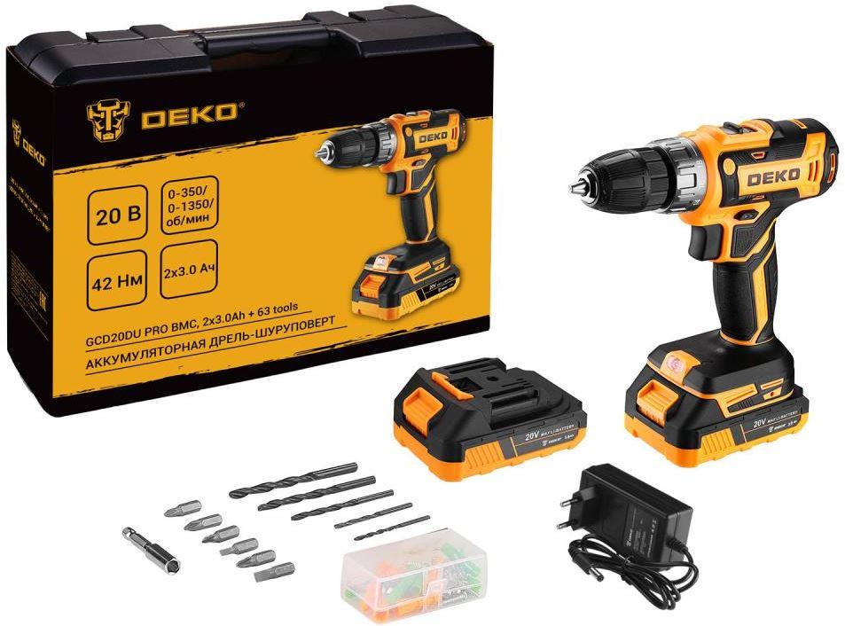 DEKO GCD20DU PRO в кейсе + набор 63 инструмента для дома, 20В, 2х3.0Ач 083-1039