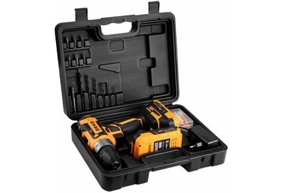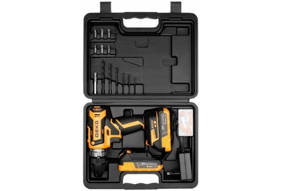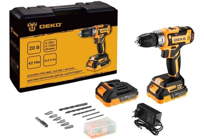 Аккумуляторная дрель-шуруповерт DEKO GCD20DU PRO BMC, 2x3.0Ah + 63 tools используется при строительных, слесарно-монтажных работах. Помогает быстро высверливать отверстия нужного диаметра как на деревянной, так и металлической поверхности, быстро вкручивать или извлекать крепеж. Технические характеристики: Макс. диаметр сверления дерево/металл: 28/10 мм Размер зажимаемой оснастки: 0,8-10 мм Число ступений крутящего момента: 18+1 Макс. крутящий момент: 42 Нм Комплектация: 1 шт дрель-шуруповерт 2 шт АКБ 1 шт зарядное устройство 6 шт сверла 6 шт биты 1 шт магнитный держатель бит 50 шт набор крепежа 1 шт руководство по эксплуатации 1 шт кейс