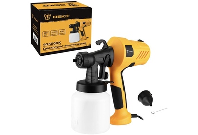 Краскопульт электрический DEKO SG500DK используется для обработки поверхности водно-меловыми и водно-известковыми составами при строительно-отделочных работах, при опрыскивании и побелке садов, дезинфекции помещений. Технические характеристики: Мощность: 500 Вт Напряжение/частота: 230-240 В/50 Гц Производительность: 650 мл/мин Емкость бака: 800 мл Макс. вязкость: 45 DIN Диаметр сопла: 2,5 мм Способ распыления: HVLP Комплектация: Краскопульт - 1 шт Игла для прочистки сопла - 1 шт Стакан для измерения вязкости материала - 1 шт Руководство по эксплуатации - 1 шт