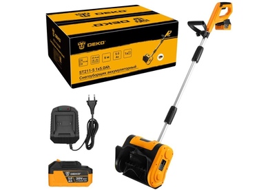 Снегоуборщик аккумуляторный DEKO ST211-5, 20В, 1*5.0Ач предназначен для уборки снега на участках, придомовых территориях и для расчистки пешеходных зон в частных хозяйствах. Аккумулятор, поставляемый в комплекте, обладает повышенной токоотдачей. Снегоуборщик поставляется в частично разобранном виде: Корпус с двигателем - 1 шт Верхняя рукоятка - 1 шт Нижняя рукоятка - 1 шт Дополнительная рукоятка - 1 шт АКБ - 1 шт В комплекте: Зарядное устройство - 1 шт Руководство по эксплуатации - 1 шт Технические характеристики: Емкость АКБ: 5000 Мач Рабочая ширина: 254 мм Рабочая высота: 160 мм Макс. дальность выброса: до 6 м Число оборотов: 2800 об/мин
