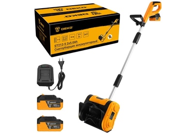 Снегоуборщик аккумуляторный DEKO ST212-5, 20В, 2*5.0Ач предназначен для уборки снега на участках, придомовых территориях и для расчистки пешеходных зон в частных хозяйствах. Аккумулятор, поставляемый в комплекте, обладает повышенной токоотдачей. Снегоуборщик поставляется в частично разобранном виде: Корпус с двигателем - 1 шт Верхняя рукоятка - 1 шт Нижняя рукоятка - 1 шт Дополнительная рукоятка - 1 шт АКБ - 2 шт В комплекте: Зарядное устройство - 1 шт Руководство по эксплуатации - 1 шт Технические характеристики: Емкость АКБ: 5000 Мач Рабочая ширина: 254 мм Рабочая высота: 160 мм Макс. дальность выброса: до 6 м Число оборотов: 2800 об/мин