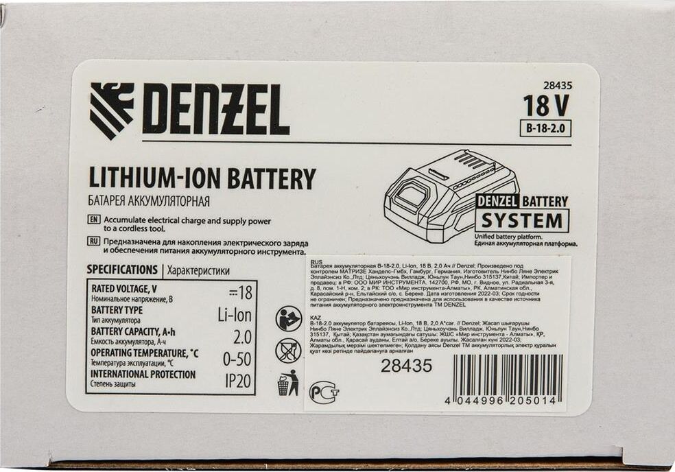 Батарея Li-Ion Denzel B-18-2.0 28435 на 2,0 Ач, номинальным напряжением 18 В, предназначена для обеспечения бесперебойной работы аккумуляторного инструмента. Совместима со всеми инструментами 18V Denzel battery system серии IB и соответствующими зарядными устройствами. Благодаря отсутствию эффекта памяти аккумулятор сохраняет максимальную эффективность на протяжении всего срока службы.ПреимуществаЗащита от перегрузок — аккумулятор отключается при превышении допустимых значений силы тока, что предотвращает его поломку.Термозащита — при возникновении угрозы перегрева батарея отключается до полного остывания.Защита от глубокого разряда и перезаряда — автоматический контроллер своевременно отключает нагрузку, исключая выход аккумулятора из строя.Контроль оставшегося времени работы — батарея оснащена LED-индикатором уровня заряда.