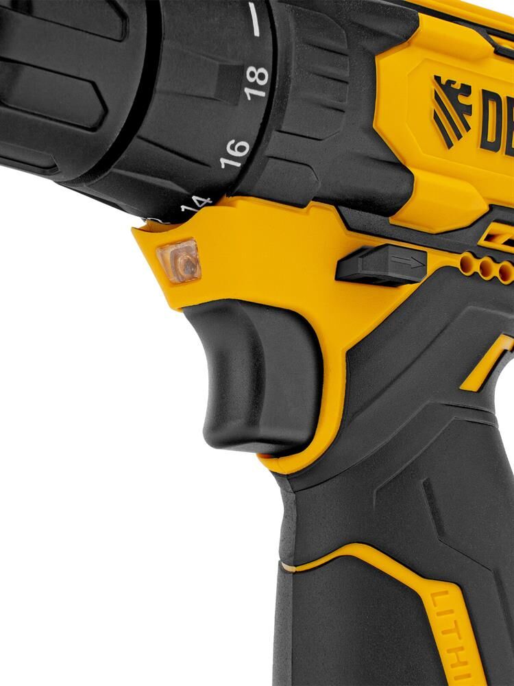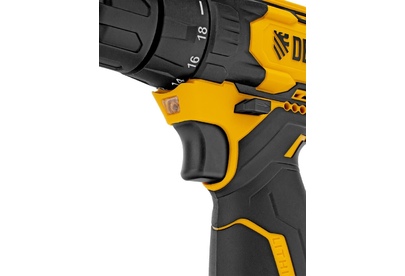 Аккумуляторная дрель-шуруповерт Denzel CDQ-12 26106 предназначена для работы с резьбовым крепежом и сверления отверстий в древесине, металле, пластике и других материалах. Максимальный диаметр отверстий в древесине составляет 20 мм, в металле — 10 мм. Инструмент работает от аккумулятора Li-Ion 12 В, развивает крутящий момент до 30 Н·м, что позволяет эффективно справляться с поставленными задачами. Преимущества Быстрая замена оснастки — блокировка шпинделя упрощает установку биты или сверла. Плавная регулировка оборотов — частота вращения шпинделя меняется в диапазоне 0-350 об/мин для завинчивания крепежа и 0-1300 об/мин для сверления. 18+1 ступень регулировки крутящего момента — можно выбрать наиболее подходящий режим в зависимости от типа крепежа и плотности материала. Тормоз свободного выбега — вращение шпинделя мгновенно прекращается после выключения, что позволяет избежать перетяжки крепежа. Удобная работа даже при плохом освещении — подсветка рабочей зоны включается одновременно с запуском двигателя. Фун