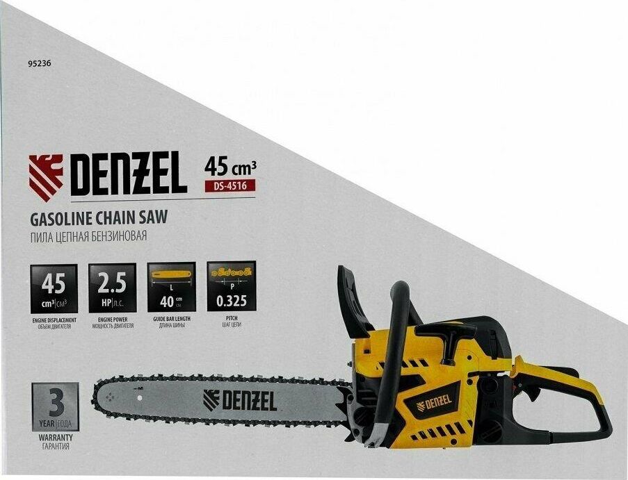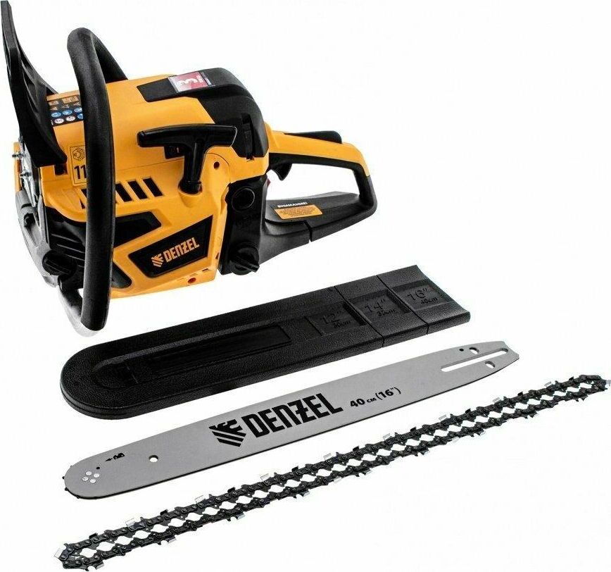Тип двигателя бензиновый 2-тактный. Мощность 2.5 л. с. Класс пилы бытовая. Количество звеньев 64 шт. Объем масляного бака 250 мл. Объем топливного бака 600 мл. Уровень шума 113 дБ. Объем двигателя 45. Длина шины 400 мм. Шаг цепи 0.325 дюйма. Толщина ведущего звена цепи 1.5 мм. Число оборотов холостого хода 3000 об/мин.