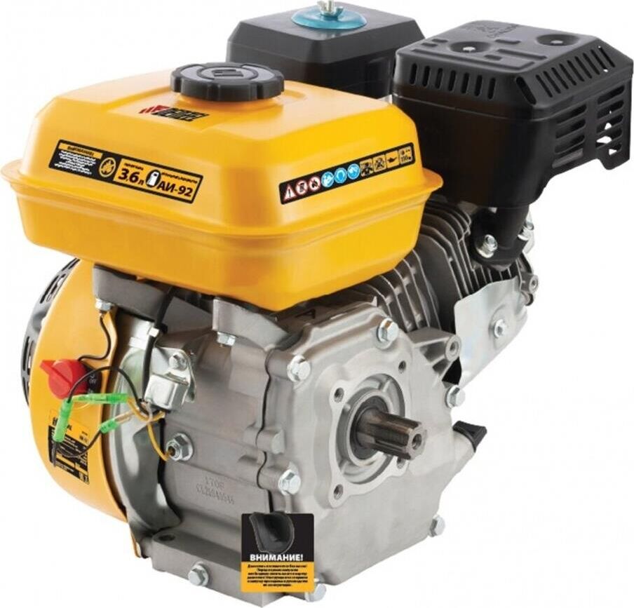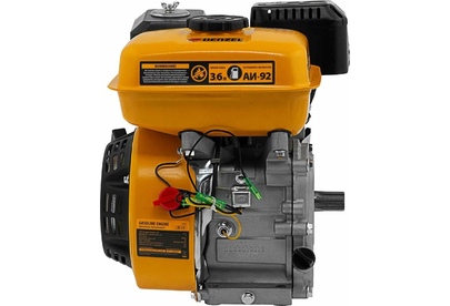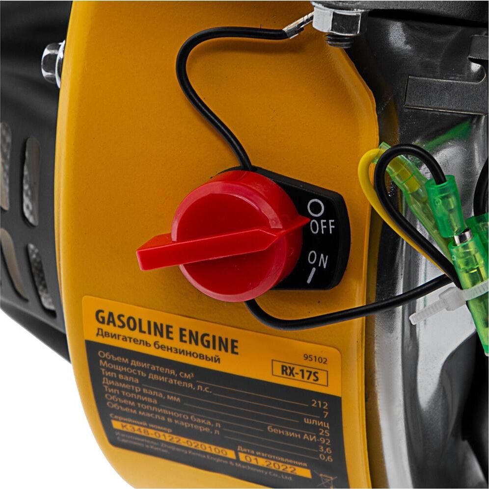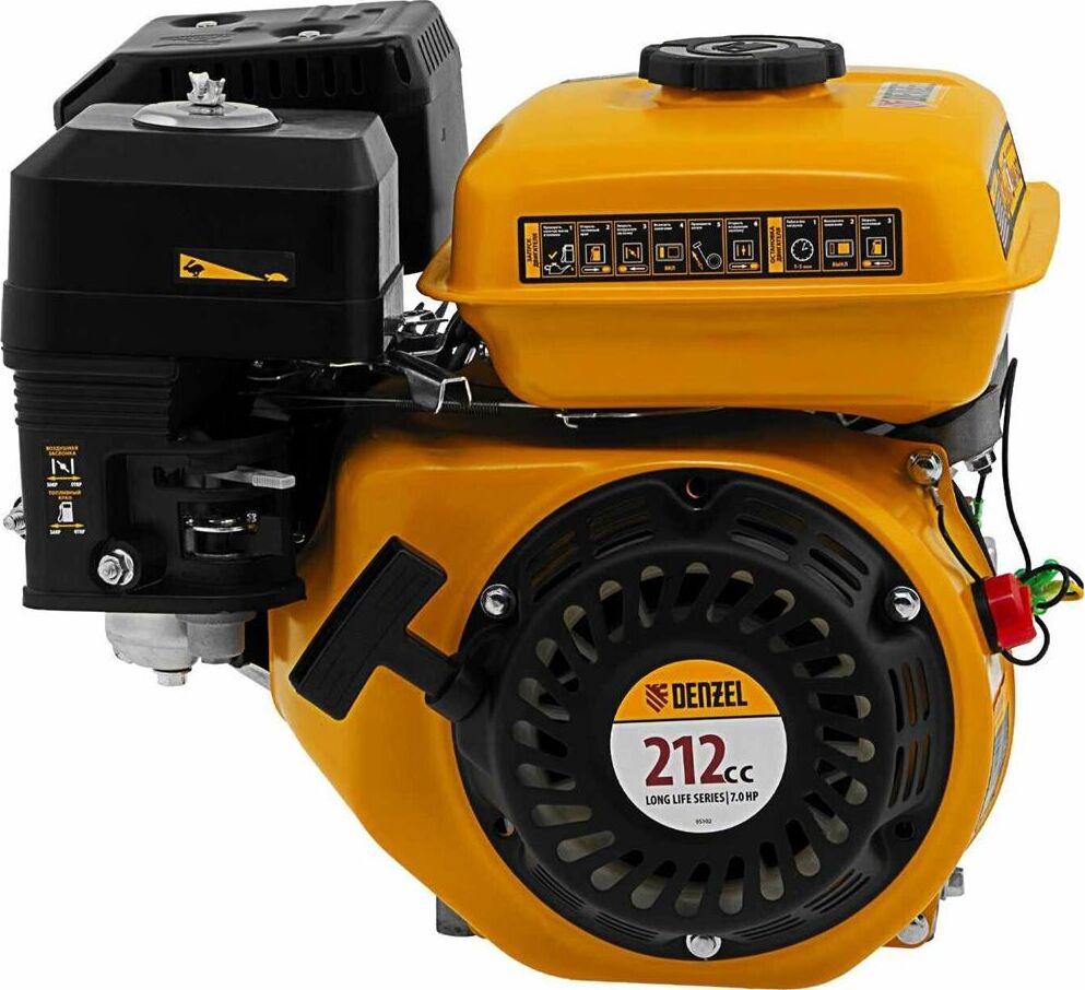 Четырехтактный бензиновый двигатель Denzel RX17S 95102 мощностью 7 л. с. и объемом 212 см3, с типом горизонтального вала шлиц 25 мм, имеет ручной старт и воздушное охлаждение. Устанавливается на бензотехнику: мотоблоки, садовые измельчители, мотопомпы, виброплиты, мойки высокого давления. Обеспечивает бесперебойное функционирование оборудования и эффективное выполнение сельскохозяйственных, строительных работ, а также решение прочих задач на загородном участке.ПреимуществаЭффективность — шлицевой выходной вал улучшает передачу крутящего момента.Экономичность — вместительный бак в сочетании с низким расходом топлива позволяет длительное время работать без дозаправки (до 3,5 часов).Надежная система запуска — усовершенствованное электронное зажигание обеспечивает уверенный и быстрый старт.Защита от поломки — при низком уровне масла двигатель не запустится.Высококачественные комплектующие — свеча зажигания Bosch, надежные узлы и детали обеспечивают длительную стабильную работу даже в условиях повышенных нагрузок.