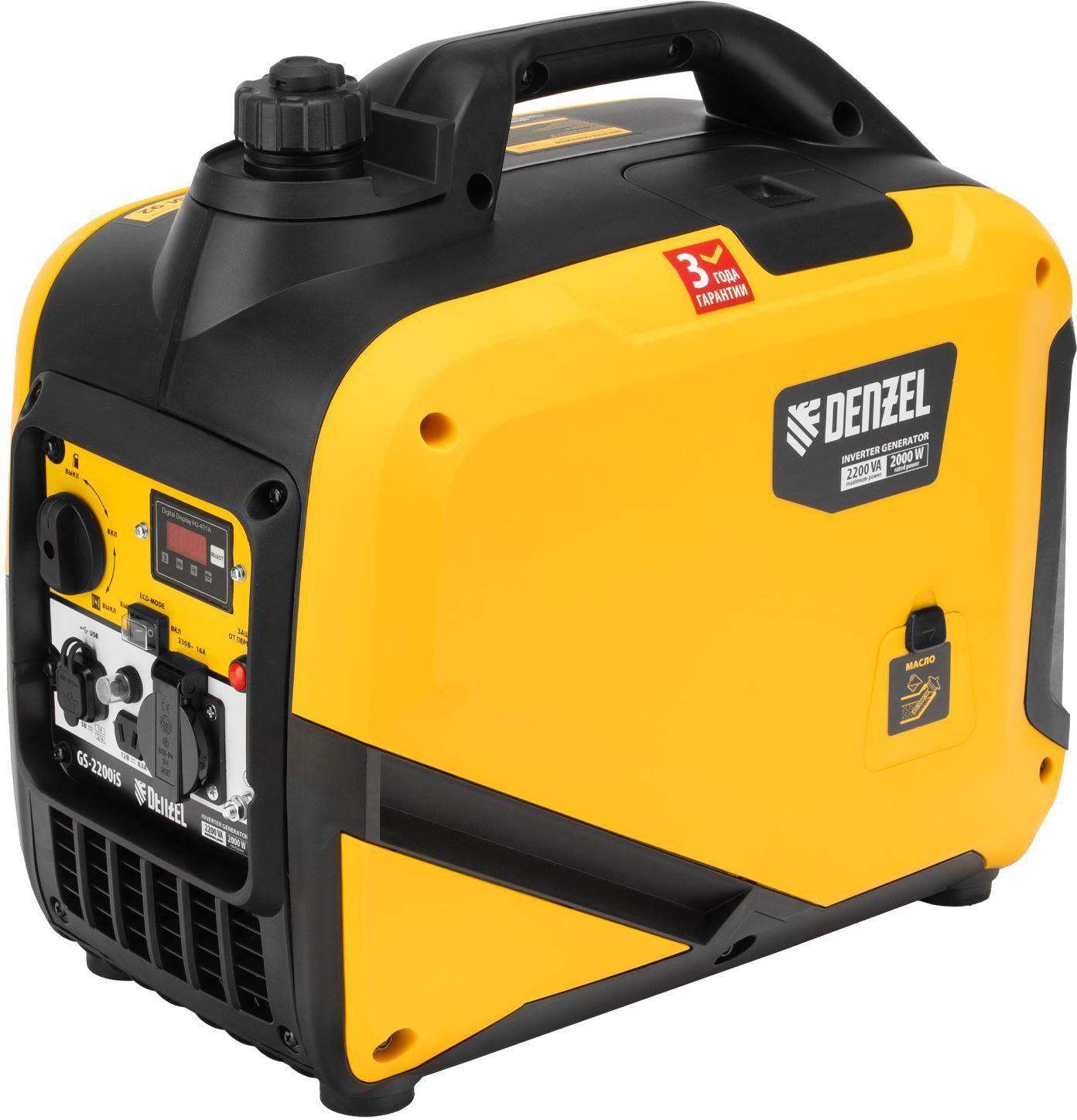 Инверторный генератор Denzel GS-2200iS 94713 максимальной мощностью 2,2 кВт, с ручным стартом, в закрытом корпусе, поддерживает напряжение 230 В и является автономным источником питания. Обеспечивает работу осветительных приборов, электроинструмента, бытовой техники в случае отсутствия подключения к электросети. Обеспечивает стабильный ток с неизменными параметрами и подходит для подключения высокоточной техники: компьютеров и т.д. Выход постоянного тока USB 5 В позволяет заряжать смартфоны, планшеты и другие гаджеты. Есть возможность зарядки автомобильных аккумуляторов — для этого предусмотрен выход 12 В. Генератор пригодится владельцам загородных домов.ПреимуществаУстойчивость к механическим воздействиям — закрытый корпус надежно защищает рабочие узлы от повреждений.Надежность — четырехтактный двигатель и альтернатор с медной обмоткой обеспечивают стабильную работу в течение всего срока службы генератора.Защита от перегрузки — при значительном превышении допустимой