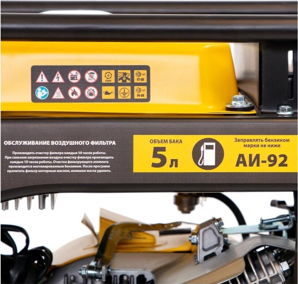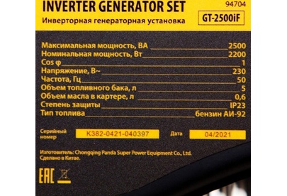Тип двигателя четырехтактный. Объем двигателя 212 см3. Мощность двигателя 7 л. с.. Номинальная мощность при 230 В 2200 Вт. Максимальная мощность при 230 В 2500 ВА. Тип топлива АИ-92. Расход топлива 1 л/ч. Объем топливного бака 5 л. Объем масла в картере 0.6 л. Степень защиты IP23. Напряжение 230 В. Тип розетки 230В/16А. Количество розеток 2. Выход 12 В есть. Контроль напряжения инвертор. Работа с автоматикой (АВР) нет. Аккумулятор в комплекте нет. Уровень шума 96 дБ. Тип кожуха открытый. Колеса и ручки в комплекте нет. Стартер ручной. Альтернатор синхронный. Обмотка альтернатора медь.
