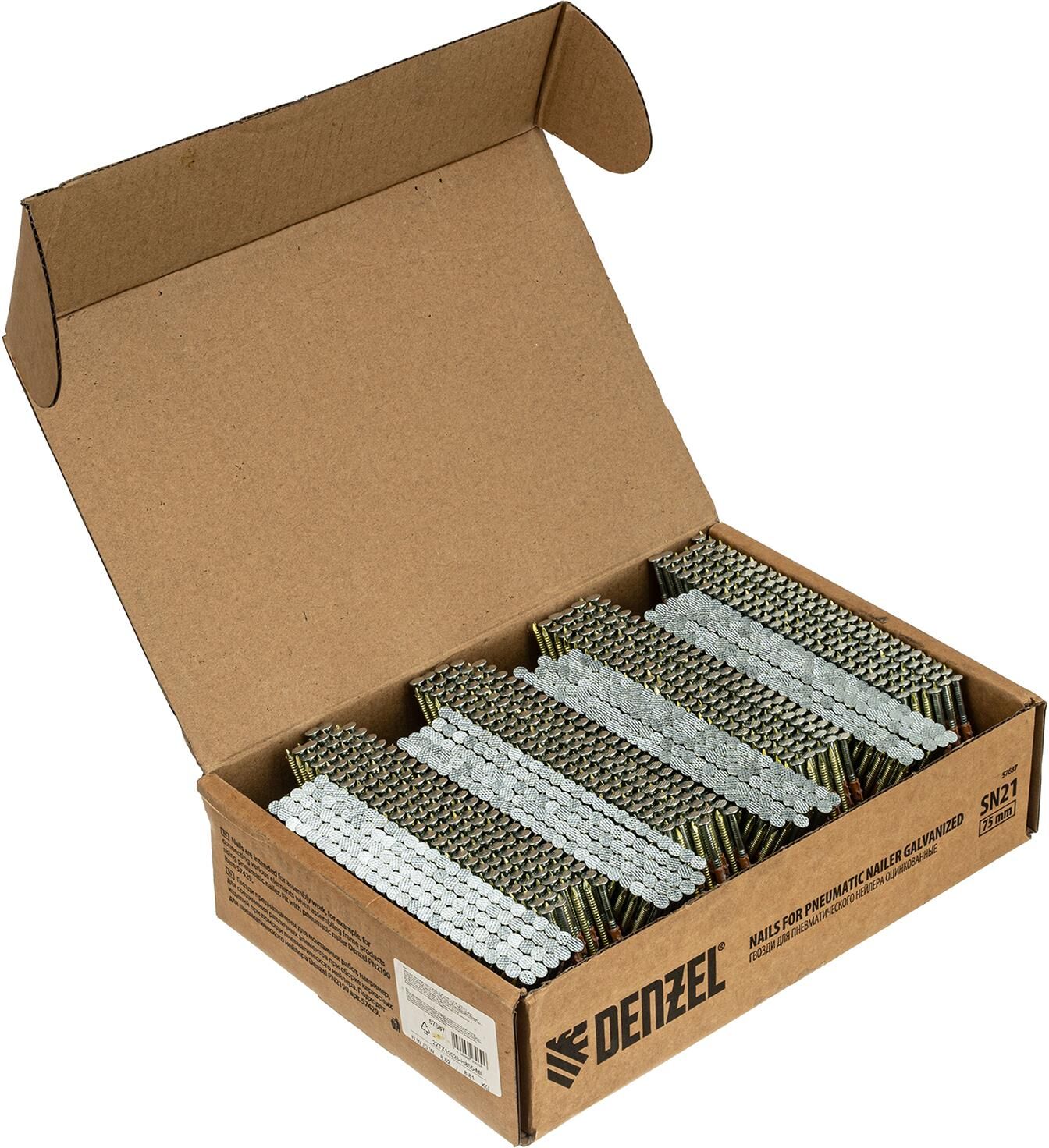 Оцинкованные гвозди Denzel 57687 типа SN21, длиной 75 мм и диаметром 3,05 мм, 2000 шт. в упаковке, — расходники для пневматического нейлера. Используются для скрепления различных материалов, будут полезны во время сборочных и отделочных работ. Преимущества Прочность и коррозионная стойкость — крепежные элементы изготовлены из стали и оцинкованы. Надежное и долговечное соединение — гвозди не гнутся, рифленая рабочая часть исключает их самопроизвольный выход из своих гнезд. Удобная комплектация — запаса из 2000 шт. хватит для выполнения большого объема работ.