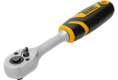 Ключ-трещотка Denzel 14031 из стали CrV, с присоединительным квадратом 1/4", с быстрым сбросом и храповым механизмом с 90 зубьями, предназначен для установки торцевых головок, а также адаптеров и удлинителей с посадочным размером соответствующего размера. Угол поворота трещотки составляет всего 4°, что упрощает работу в труднодоступных местах. Инструмент будет полезен в сервисном центре, на СТО, а также пригодится дома или в поездке. Преимущества Прочность и износостойкость — инструмент изготовлен из высококачественной стали CrV и закален до твердости 50-54 HRC. Комфортная эксплуатация — эргономичная рукоятка удобно ложится в руку. Удобная работа — храповой механизм обеспечивает плавное вращение. Эффективное решение широкого спектра задач — благодаря механизму быстрого сброса замена насадки занимает несколько секунд. Мгновенный переход от монтажа к демонтажу — металлический переключатель позволяет менять направление вращения одним движением. Надежная фиксация — шариковый фиксатор крепко удерживает насадку, по