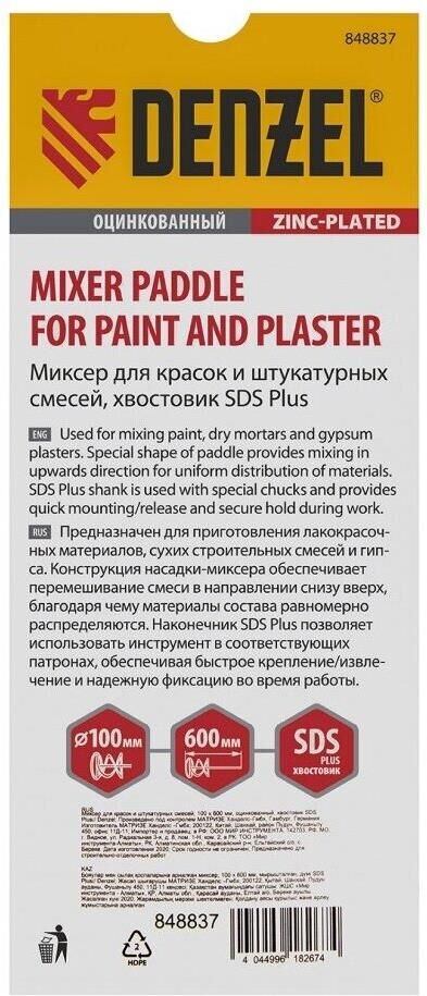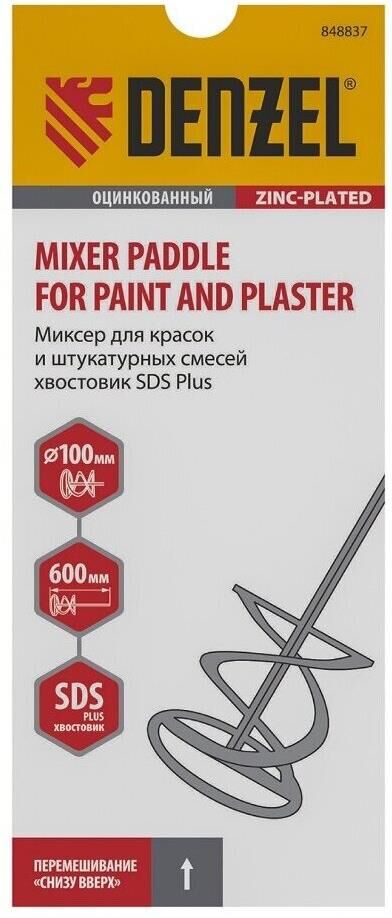 Оцинкованный миксер для красок и штукатурных смесей Denzel 848837, 100 х 600 мм, с хвостовиком SDS Plus, используется для замешивания строительных растворов. Спиралевидная рабочая часть перемешивает состав снизу вверх, поэтому все компоненты распределяются в нем равномерно. Защитное кольцо предотвращает повреждение емкости для размешивания состава. Штукатурный миксер устанавливается в патрон перфоратора SDS Plus и применяется во время строительных и отделочных работ.ПреимуществаПрочная сварная конструкция стального миксера не деформируется под действием динамических нагрузок и рассчитана на интенсивное применение.Насадка-миксер оцинкована, поэтому устойчива к коррозии и механическим повреждениям.Хвостовик SDS Plus позволяет быстро устанавливать миксер в патрон перфоратора и обеспечивает его надежную фиксацию во время работы.