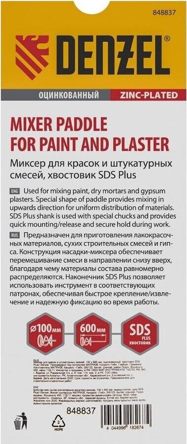 Оцинкованный миксер для красок и штукатурных смесей Denzel 848847, 120 х 600 мм, с хвостовиком SDS Plus, используется для замешивания строительных растворов. Спиралевидная рабочая часть перемешивает состав снизу вверх, поэтому все компоненты распределяются в нем равномерно. Защитное кольцо предотвращает повреждение емкости для размешивания состава. Штукатурный миксер устанавливается в патрон перфоратора SDS Plus и применяется во время строительных и отделочных работ.ПреимуществаПрочная сварная конструкция стального миксера не деформируется под действием динамических нагрузок и рассчитана на интенсивное применение.Насадка-миксер оцинкована, поэтому устойчива к коррозии и механическим повреждениям.Хвостовик SDS Plus позволяет быстро устанавливать миксер в патрон перфоратора и обеспечивает его надежную фиксацию во время работы.