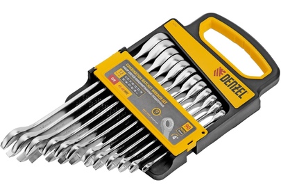 Набор комбинированных трещоточных ключей Denzel 14722 состоит из 12 инструментов из стали CrV, размером 6-19 мм, с покрытием «матовый хром». Используется для проведения монтажных и демонтажных работ с резьбовыми соединениями, в том числе в труднодоступных местах. У каждого ключа 2 рабочих профиля, что расширяет возможности использования набора. Инструменты пригодятся дома и в гараже. Преимущества Прочность и долговечность — ключи изготовлены из хромованадиевой стали, матовое хромовое покрытие защищает их от повреждений и коррозии. Износостойкость — твердость рабочих частей составляет 43-48 HRC, поэтому они не деформируются при работе со значительным усилием. Аккуратная работа — 12-гранная накидная часть увеличивает площадь соприкосновения с головкой крепежа и снижает риск ее деформации. Комфортная эксплуатация — храповой механизм с 90 зубьями обеспечивает максимально плавный ход, шаг трещотки составляет 4°.