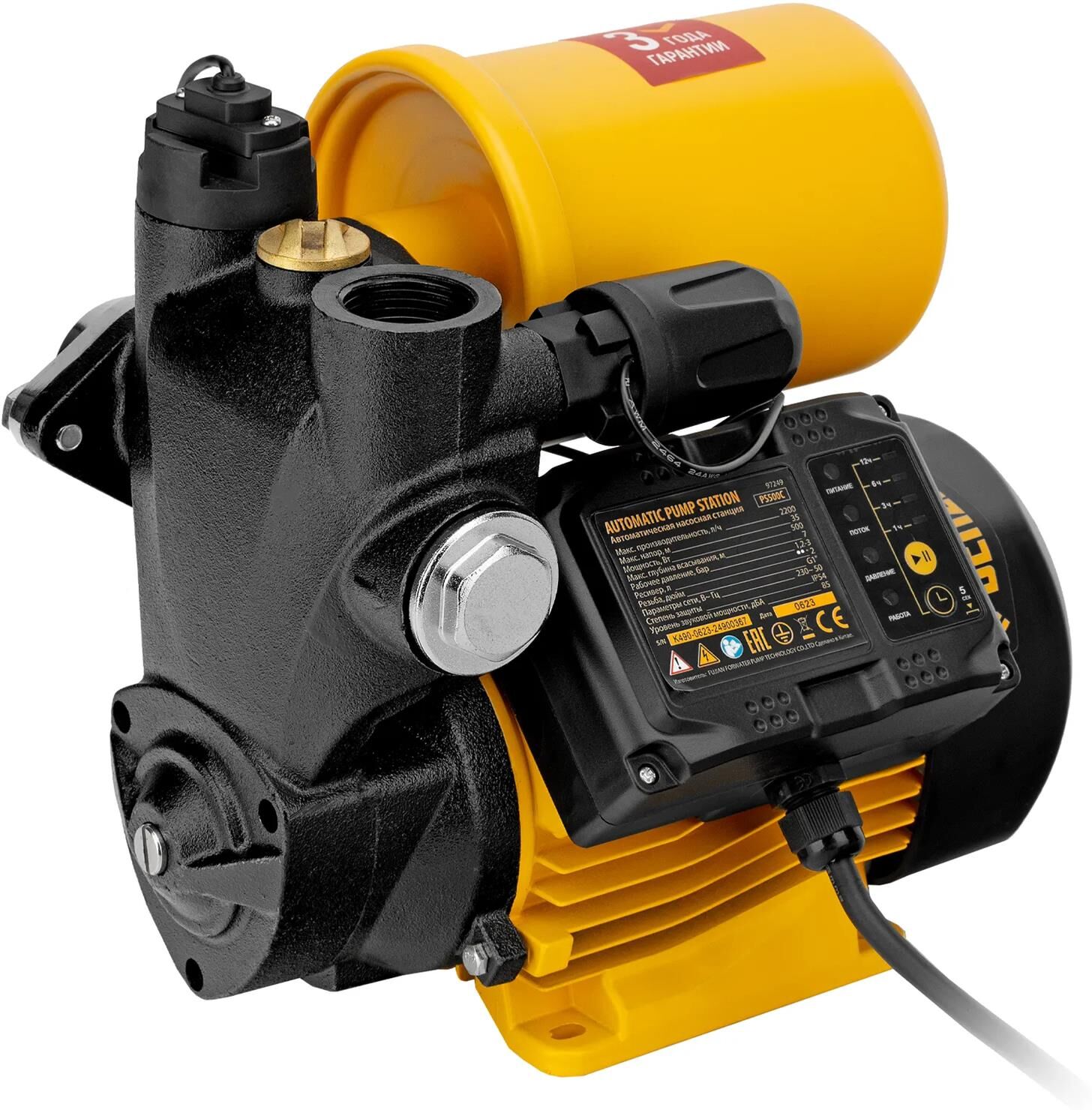 Конструкция насосной части - вихревой Материал корпуса насосной части - чугун Номинальное напряжение - 230 В Мощность, Вт - 500 Длина кабеля питания, м - 1.5 Защита и безопасность - блокировка случайного запуска, защита от перегрева, реле давления, саморегуляция Максимальная высота всасывания, м - 7 Максимальная производительность, л/ч - 2200 Максимальная температура жидкости, °C - 40 Максимальный диаметр прокачиваемых частиц, мм - 0.5 Максимальный напор насоса, м - 35 Модель - PS500C Объем ресивера, л - 2 Комплектация товара Насосная станция - 1 шт Руководство по эксплуатации и гарантийный талон - 1 шт
