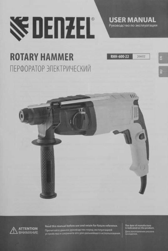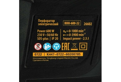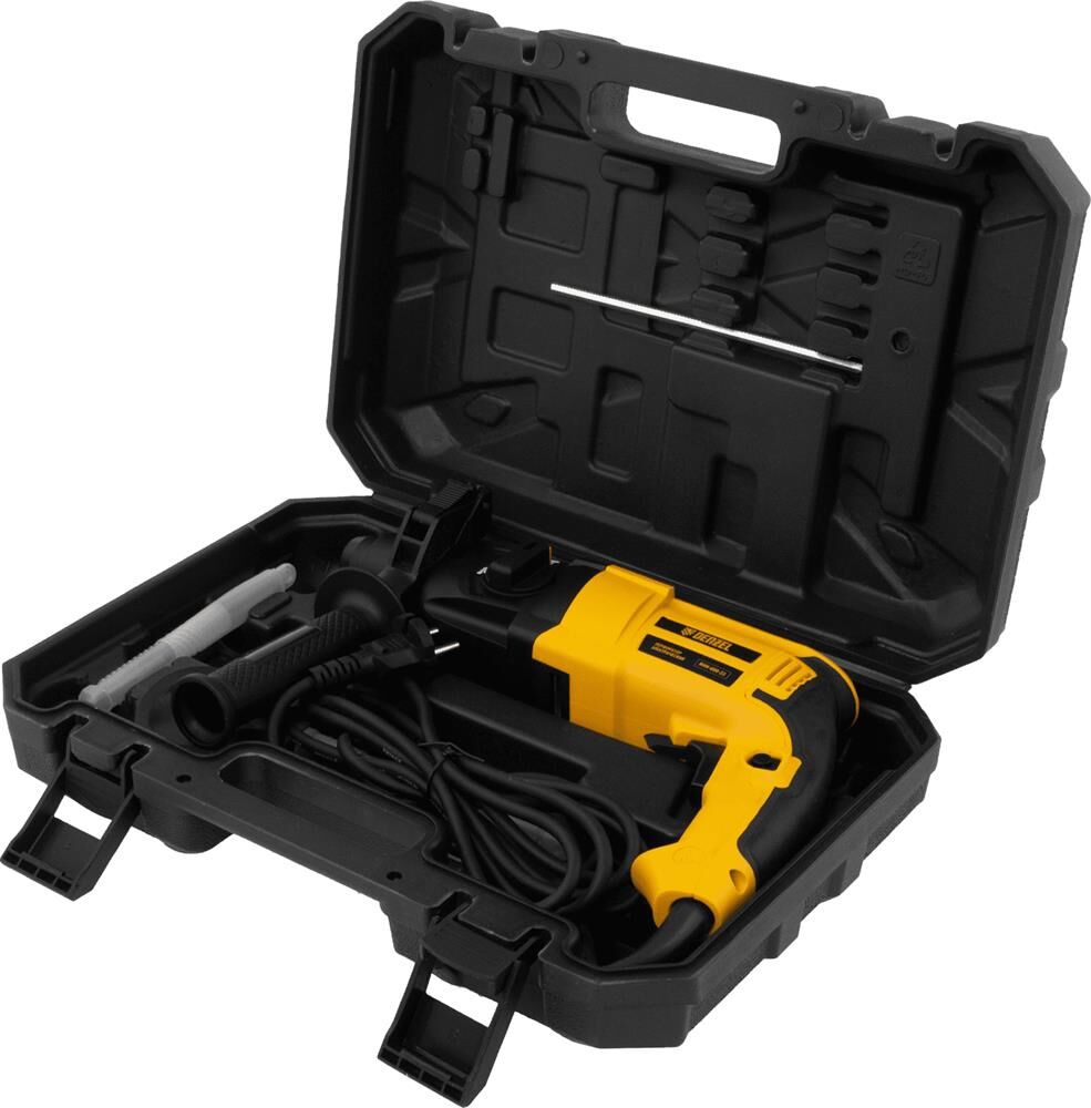 Электрический перфоратор Denzel RHH-600-22 26602 мощностью 600 Вт, с патроном под хвостовик SDS-plus, развивает энергию удара 2,5 Дж и способен работать в 2-х режимах: сверление и сверление с ударом. Используется для получения отверстий в бетоне, камне, кирпиче, для штробления стен, а также сверления металла, пластика, древесины и других материалов. Максимальный диаметр сверления в бетоне составляет 22 мм, в древесине — 30 мм, в стали — 13 мм. Инструмент будет полезен любителям и профессионалам при выполнении ремонтно-строительных работ.ПреимуществаНастройка оптимального режима — скорость вращения шпинделя и частота ударов плавно регулируются в диапазоне 0-1000 об/мин и 0-3900 уд/мин соответственно.Реверс — смена направления вращения оснастки облегчает извлечение застрявшего бура.Точность выполняемых работ — ограничитель глубины сверления позволяет получать одинаковые отверстия.
